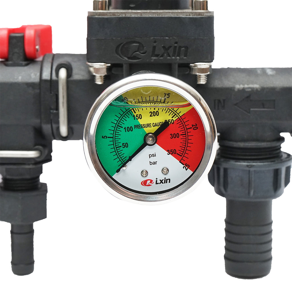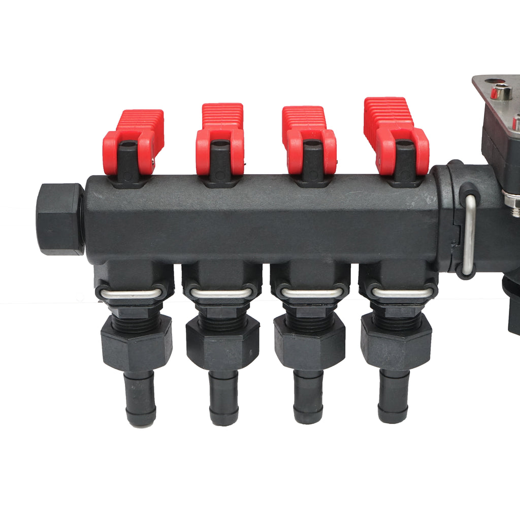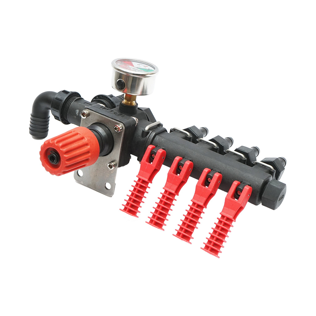 4-UTAS OSZTÓEGYSÉG NYOMÁSMÉRŐVEL PERMETEZŐGÉPHEZ négyágú elosztó, amelyet permetezőgépekhez terveztek. A glicerinnel töltött manométer lehetővé teszi a nyomás pontos és stabil leolvasását működés közben. Az elosztó 28 mm-es bemenettel és négy darab 15 mm átmérőjű kimenettel rendelkezik, biztosítva a folyadék egyenletes eloszlását az egyes szakaszok között.