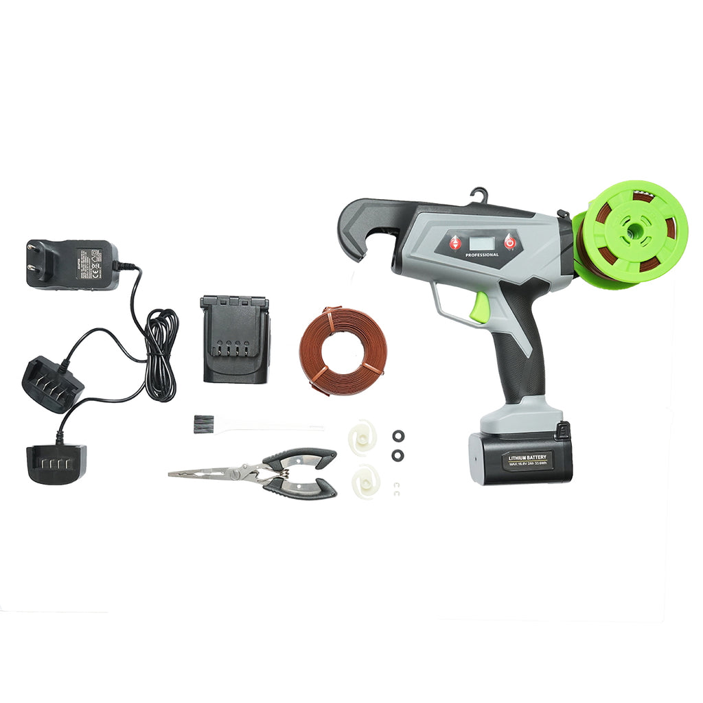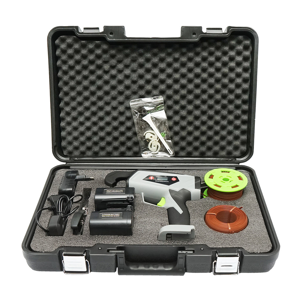 Nagy teljesítményű automata kötözőgép szőlőtőkék, zöldségek és gyümölcsfák hatékony kötözéséhez. A készülék 16.8 V-os lítium-ion akkumulátorral működik, 60 W névleges teljesítménnyel, és legfeljebb 25 mm átmérőjű kötegek rögzítésére alkalmas. Robusztus kivitel, gyors és precíz működés, ideális nagyobb volumenű munkákhoz is.
