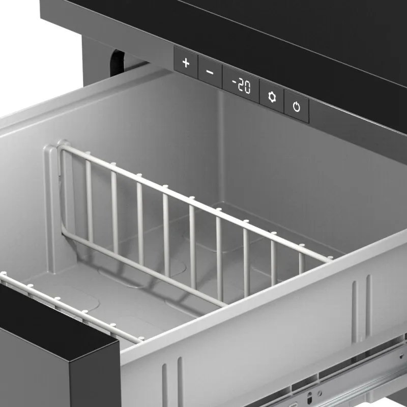 BEÉPÍTHETŐ SMART AUTÓS HŰTŐSZEKRÉNY KOMPRESSZORRAL, 60W, 20L KAPACITÁS, 12–24V, HŰTÉSI TARTOMÁNY: -20 °C – +20 °C hordozható és beépíthető kivitelben is használható hűtőberendezés, amely Bluetooth kapcsolaton keresztül vezérelhető okostelefonos alkalmazással. A készülék LED kijelzővel ellátott elektronikus vezérlést kínál, belső LED világítással, valamint kivehető tárolófiókkal rendelkezik. A működéshez szükséges adapterek (12/24V autós csatlakozó és 220V hálózati adapter) a csomag részét képezik. A hűtőgép -20 °C-ig hűt és +20 °C-ig fűt, rezgéscsillapított kialakítással, három szintű akkumulátor-védelemmel, ECO és MAX üzemmóddal.