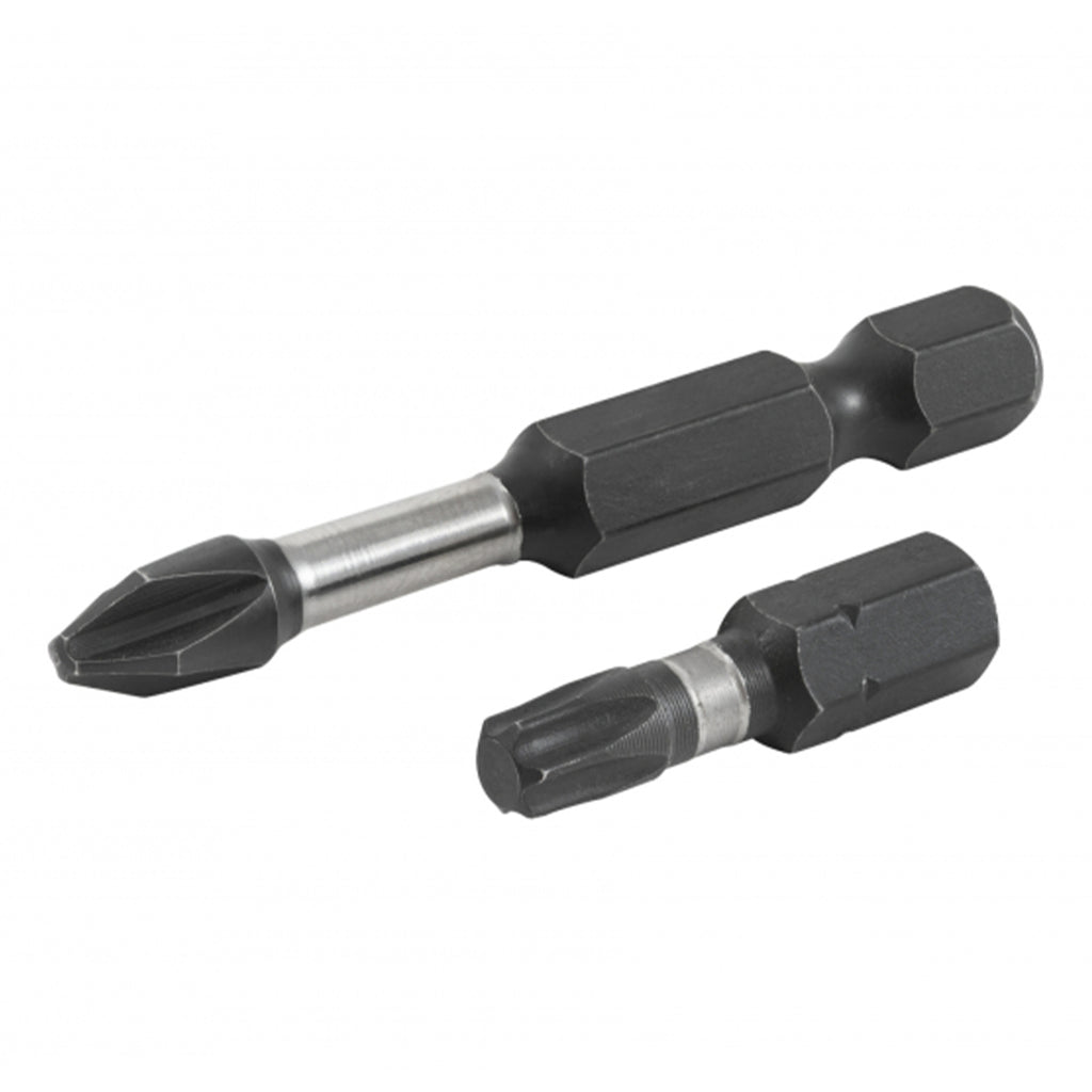 A készlet tartalmaz továbbá 8 darab 1/4"-os, 50 mm hosszú S2 acél bitet: PH1, PH2, PZ2 (2 db), PZ3, T20 (2 db) és T25. Emellett található benne egy 1/4" x 3/8" adapter és egy ütvecsavarozó bittartó.