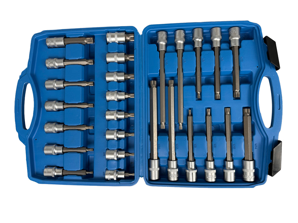 Ez a BIT KÉSZLET XZN M SPLINE 1/2" 26 DB Cr-V anyagból készült, matt felületkezeléssel és knurling (recézett) kialakítással a biztos fogás érdekében.
