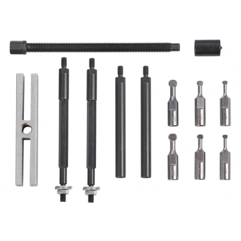 A cserélhető gömbvégű adapterek – 5,5 mm, 6 mm és 8 mm méretben – a csapágy belső gyűrűjébe rögzíthetők, és blokkolás után biztonságos és pontos kihúzást tesznek lehetővé.