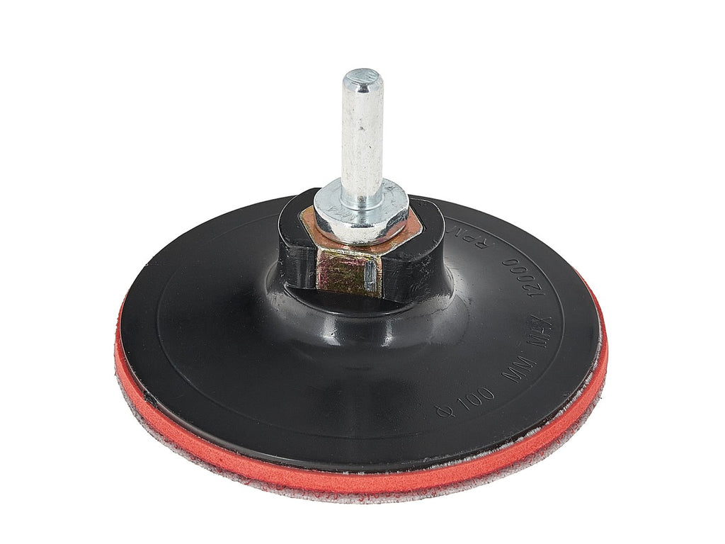 A tárcsa átmérője 100 mm, és Velcro (tépőzáras) rögzítőrendszerrel rendelkezik. A hordozó tárcsa tartós anyagból készül, piros színű habréteggel a rezgéscsillapítás érdekében. A készlet tartalmaz egy M14 menetes hordozó tárcsát, egy fúrógéphez való adaptert (M14 külső menet – 6 mm szár) és egy csiszolókorongot.