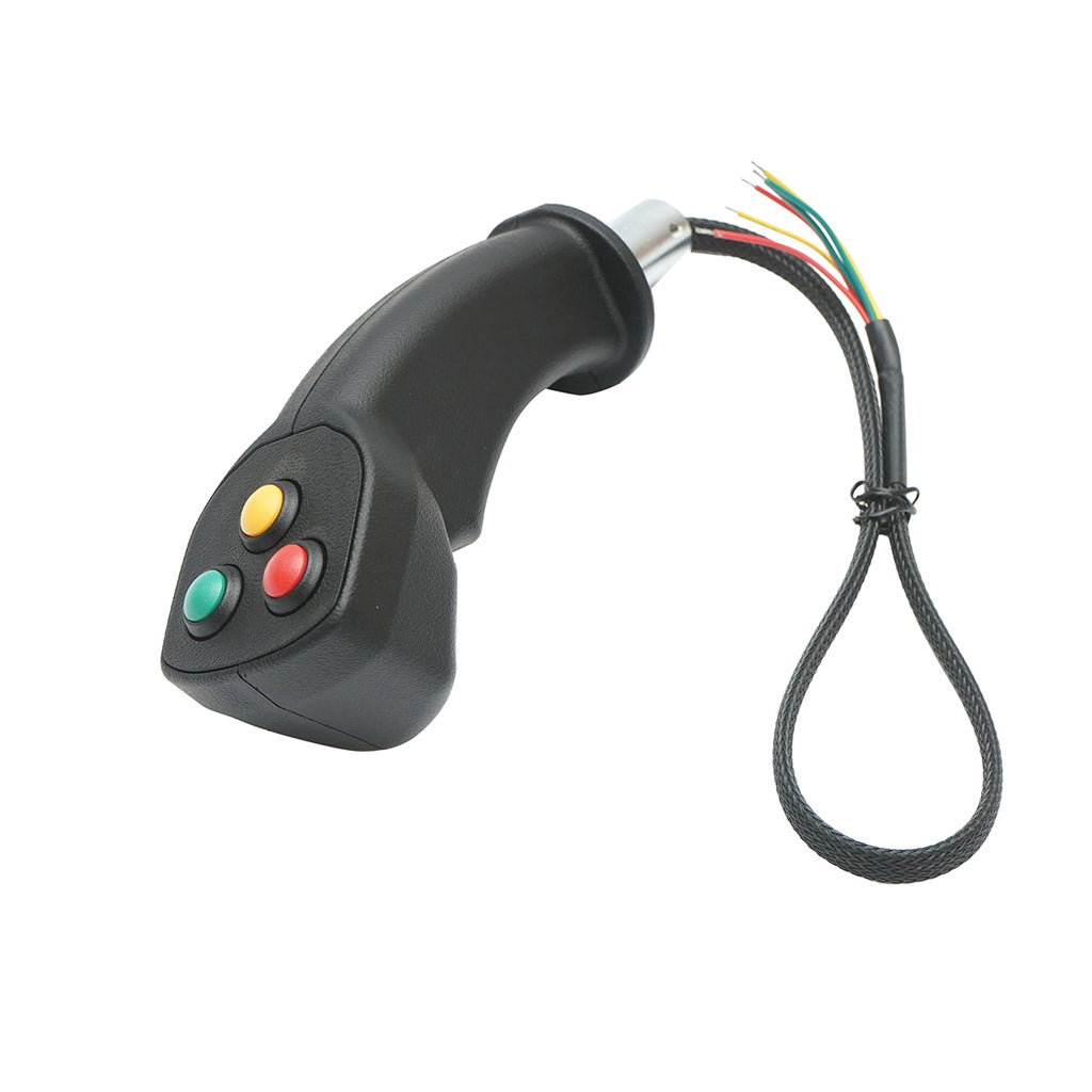 ELEKTROMOS JOYSTICK, 3 GOMBOS, L-DK-03 három beépített nyomógombbal rendelkező elektromos vezérlőkar, amely ipari vagy mezőgazdasági gépek vezérlőrendszeréhez használható. Lehetővé teszi a mozgás több irányú vezérlését, a gombok pedig külön funkciókhoz rendelhetők. Kialakítása révén precíz vezérlést biztosít.