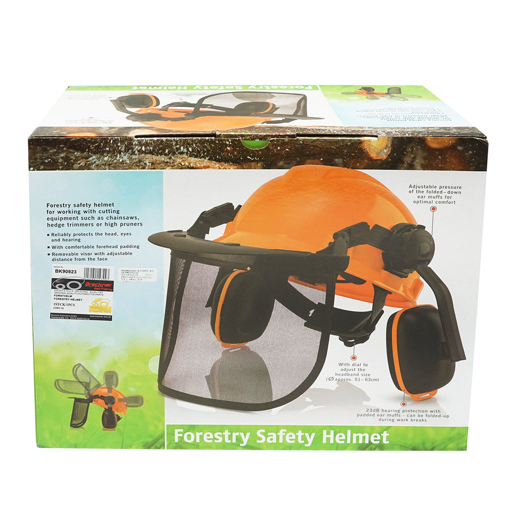 ERDÉSZETI VÉDŐSISAK BRECKNER GERMANY erős és tartós fejvédelmi eszköz, amely az erdészeti és fakitermelési munkák során biztosít védelmet. A készlet tartalmaz sisakot, vizort tartóval, fülvédőt, állítható fejpántot, a fülvédőkhöz tartozó állítószerkezetet és fejpántot. A sisak belső részében bélés található a kényelmesebb illeszkedés érdekében. A fülvédők 23 dB-ig csökkentik a zajszintet, védőbetéttel rendelkeznek, valamint összecsukható kivitelűek. A sisakméret kb. 51–63 cm között állítható.