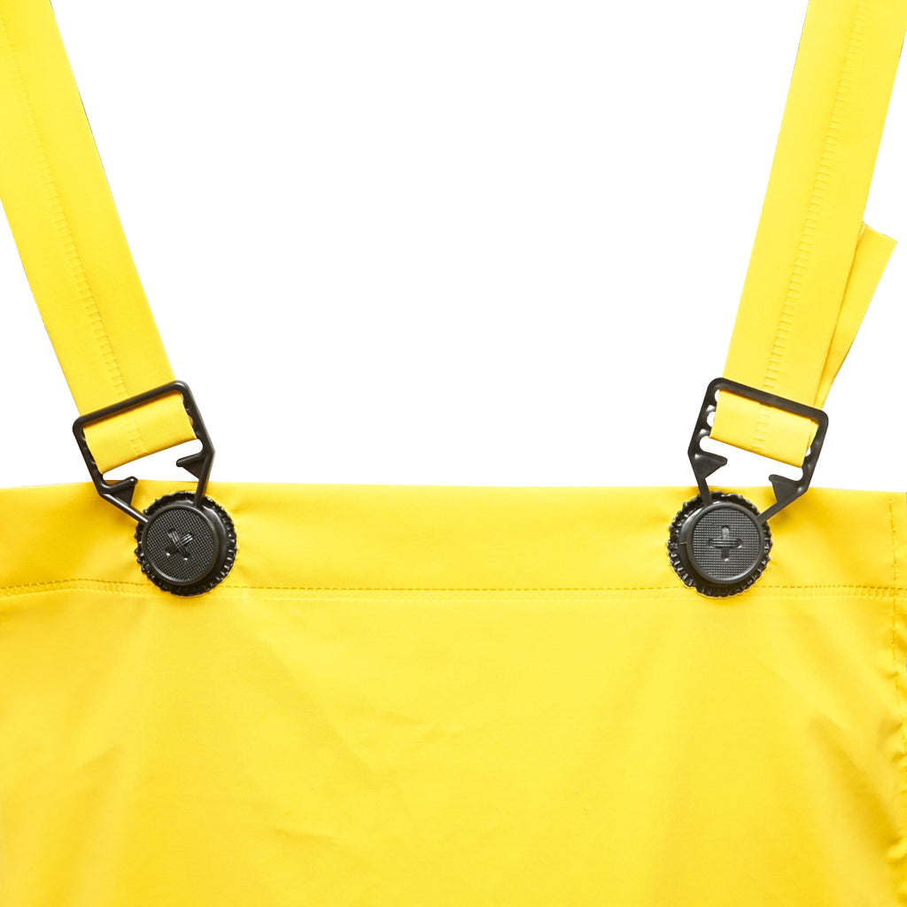 Ez a Breckner Germany által gyártott vízálló munkaruha tökéletes választás esős vagy nedves körülmények között végzett munkákhoz. A szett egy kapucnis dzsekiből és egy kantáros nadrágból áll, melyeket strapabíró poliészter és PVC kombinációja alkot. A 0.28 mm vastagságú anyag biztosítja a teljes vízzárást, miközben megfelelő rugalmasságot is nyújt. A dzseki elöl cipzárral záródik, melyet patentos fedés véd az esőtől. Két elülső zseb praktikus tárolóhelyet biztosít a legszükségesebb eszközöknek.