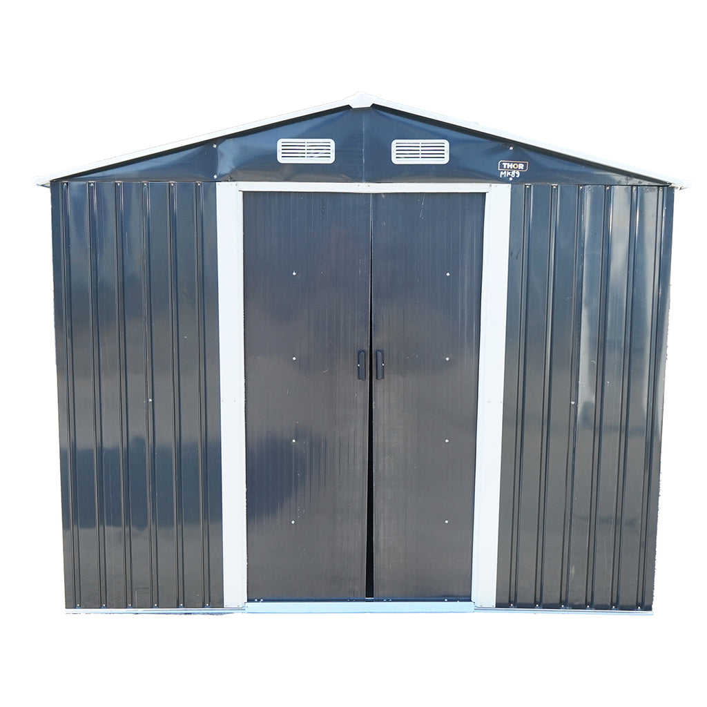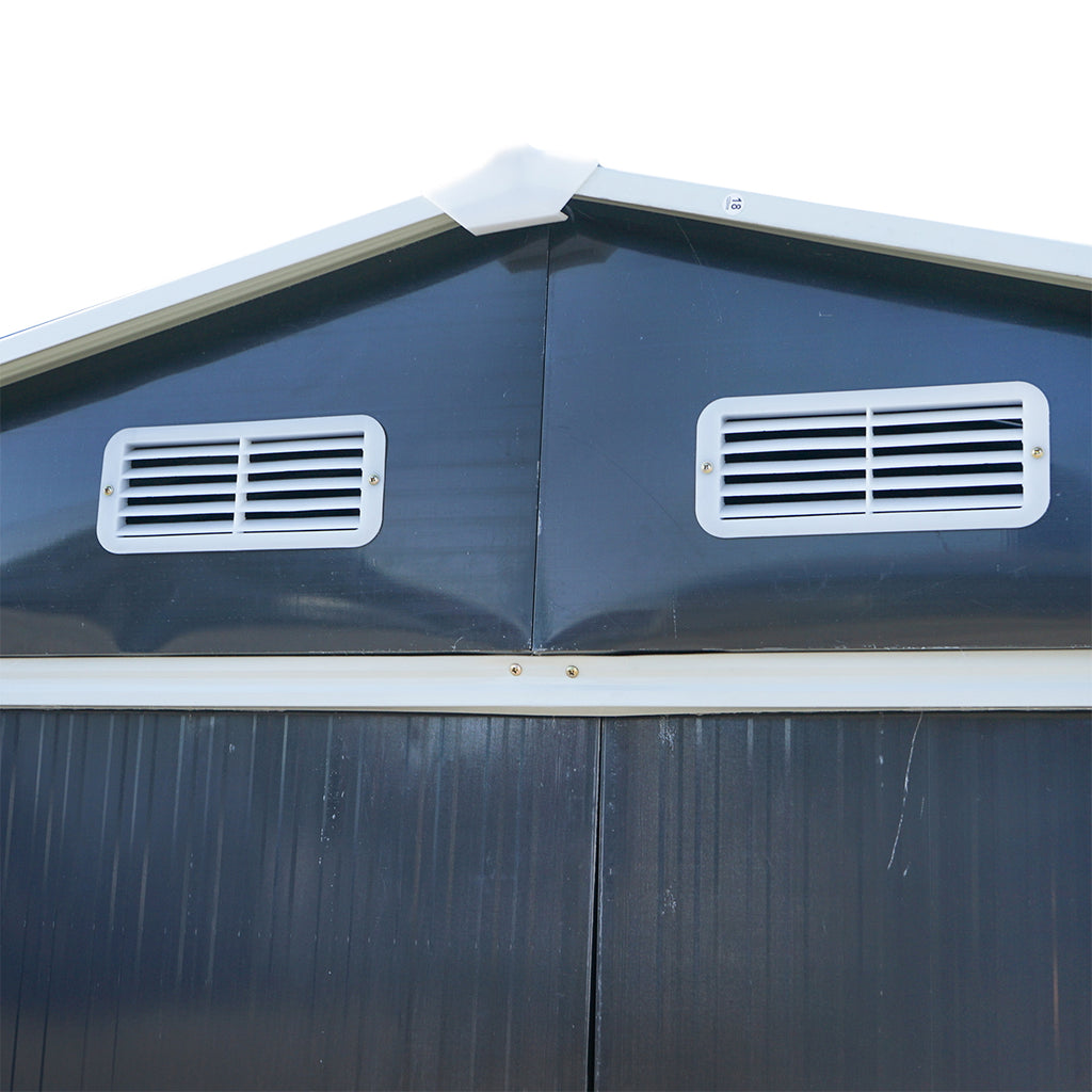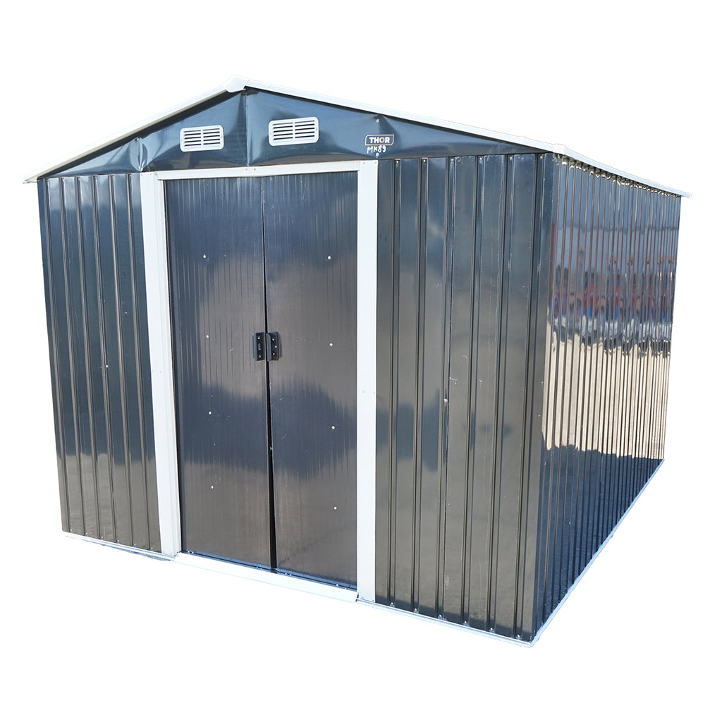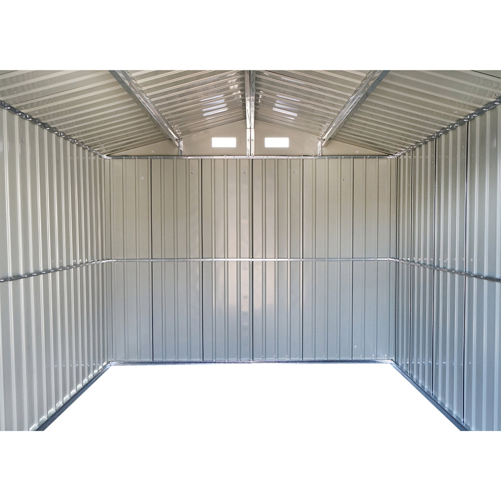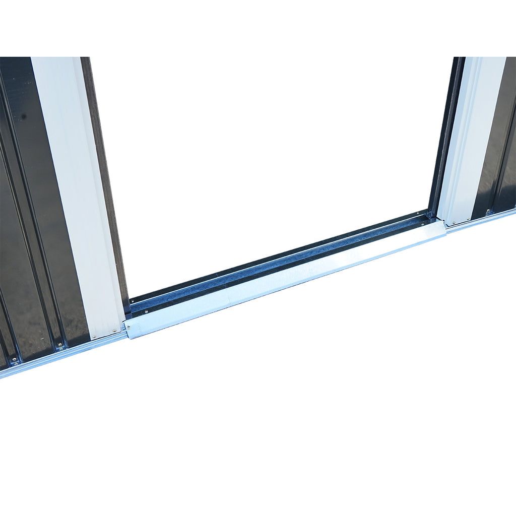 FÉM KERTI TÁROLÓ, 312X257X212 CM méretben készült, két tolóajtóval ellátva, amelyek együttes mérete 98 x 170 cm. A szerkezet 0,6 mm vastag horganyzott acélprofilokból áll, amelyek tartósságot és stabilitást biztosítanak kültéri használat során.