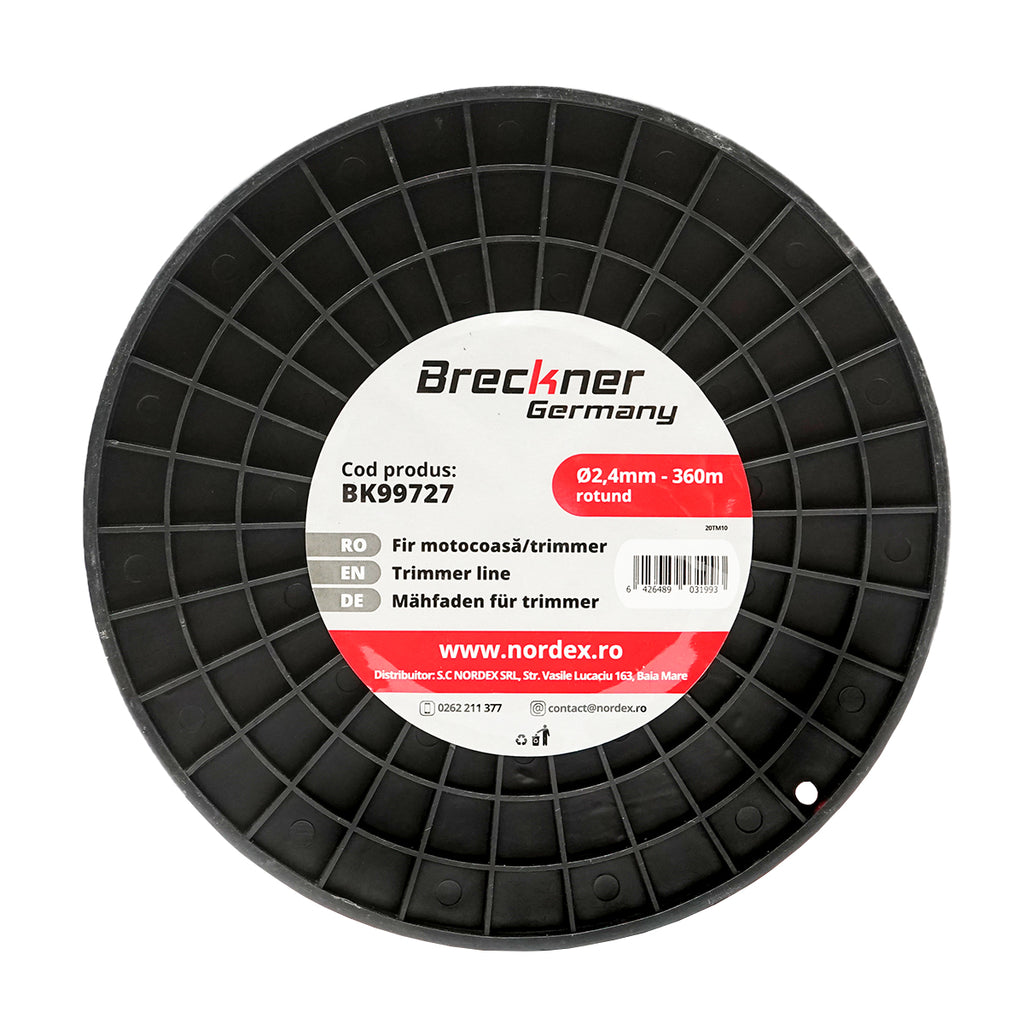 FŰKASZA DAMIL, KEREK PROFILÚ, 2,4 MM × 360 M, PIROS BRECKNER GERMANY kör keresztmetszetű damil, amely motoros fűkaszákhoz használható. Átmérője 2,4 mm, teljes hossza 360 méter, különböző fűnyírási és gazvágási munkákhoz alkalmazható.