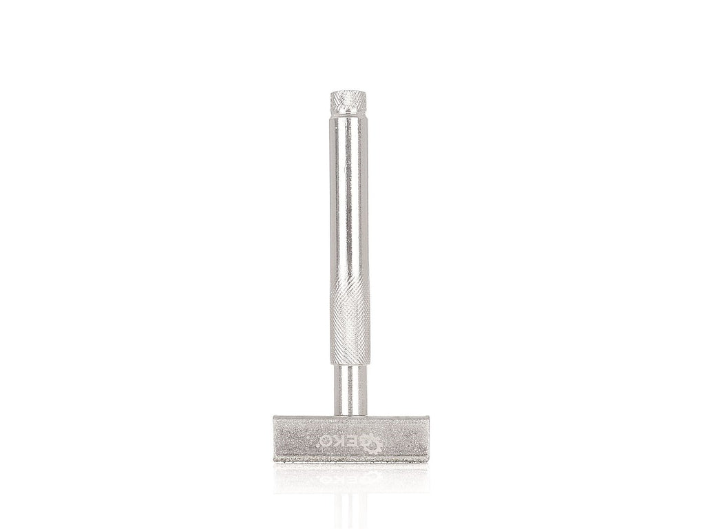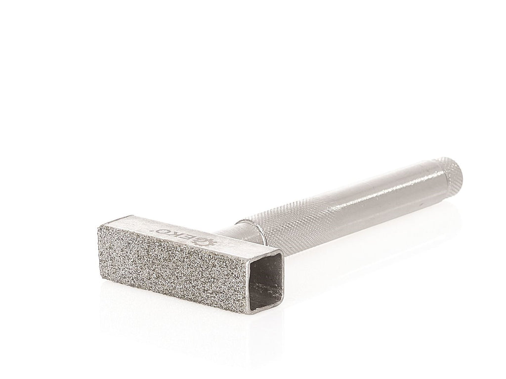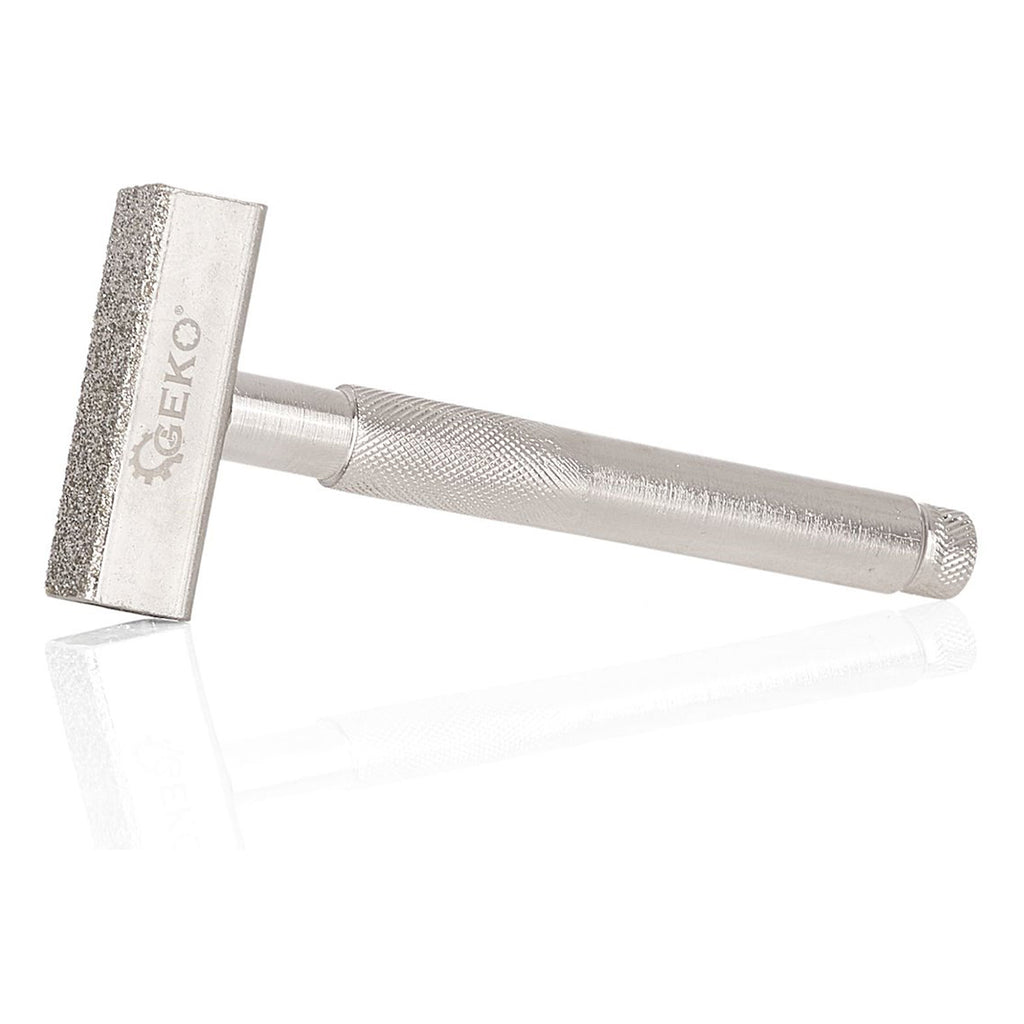 Ez a GYÉMÁNTSZEMCSÉS KÖSZÖRŰKŐ SZABÁLYZÓ GEKO 45 x 13 mm méretű gyémántbevonattal van ellátva, és fehér valamint barna korundból készült köszörűkövek igazítására és felújítására szolgál.
