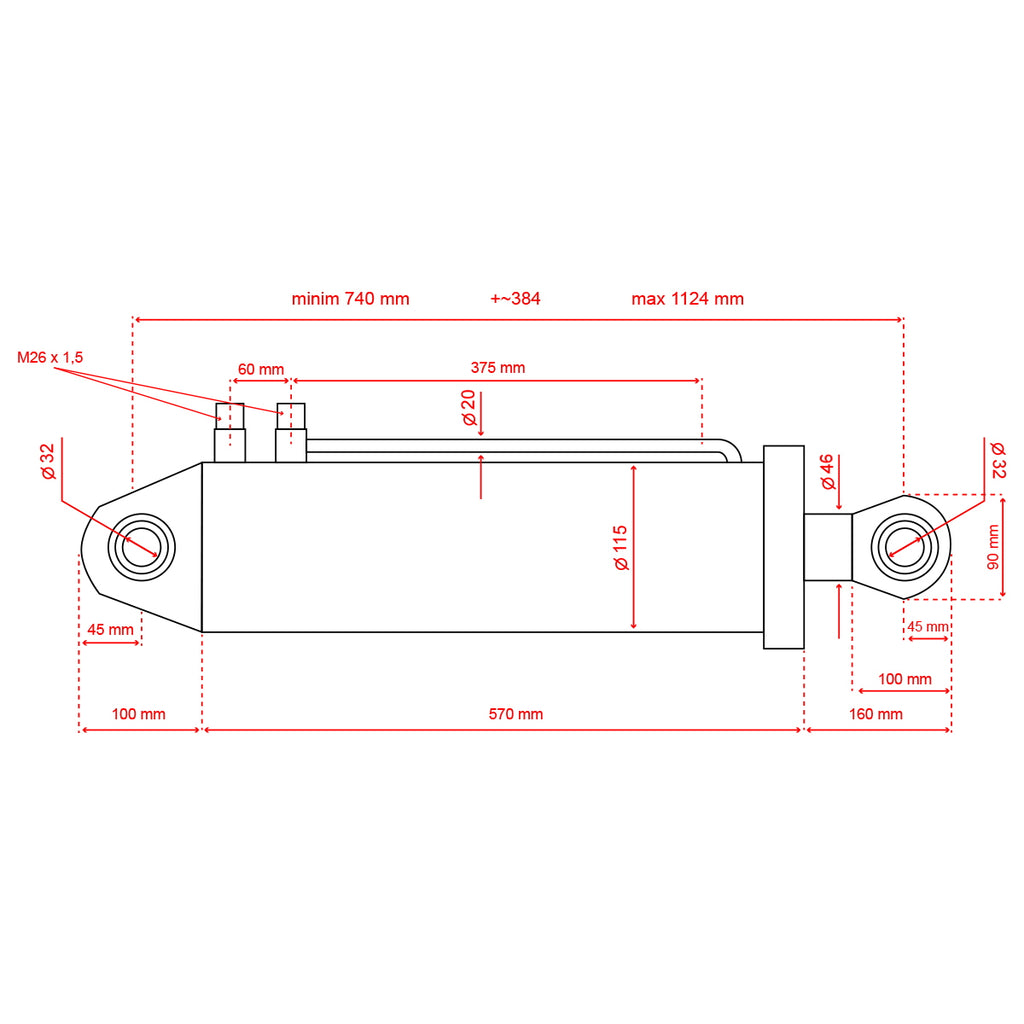 HÁTSÓ HIDRAULIKUS MUNKAHENGER TOLÓLAPHOZ ÉS SÁRKAPARÓHOZ 90X115X46X740X570X384 MM MÉRETBEN ERDEI TRAKTORHOZ egy hátsó hidraulikus munkahenger, amely erdészeti traktorokon használható tolólap és sapa mozgatására. A megadott méretek alapján a munkahenger átmérője, szárátmérője, csapméretei és lökethossza is meghatározható.