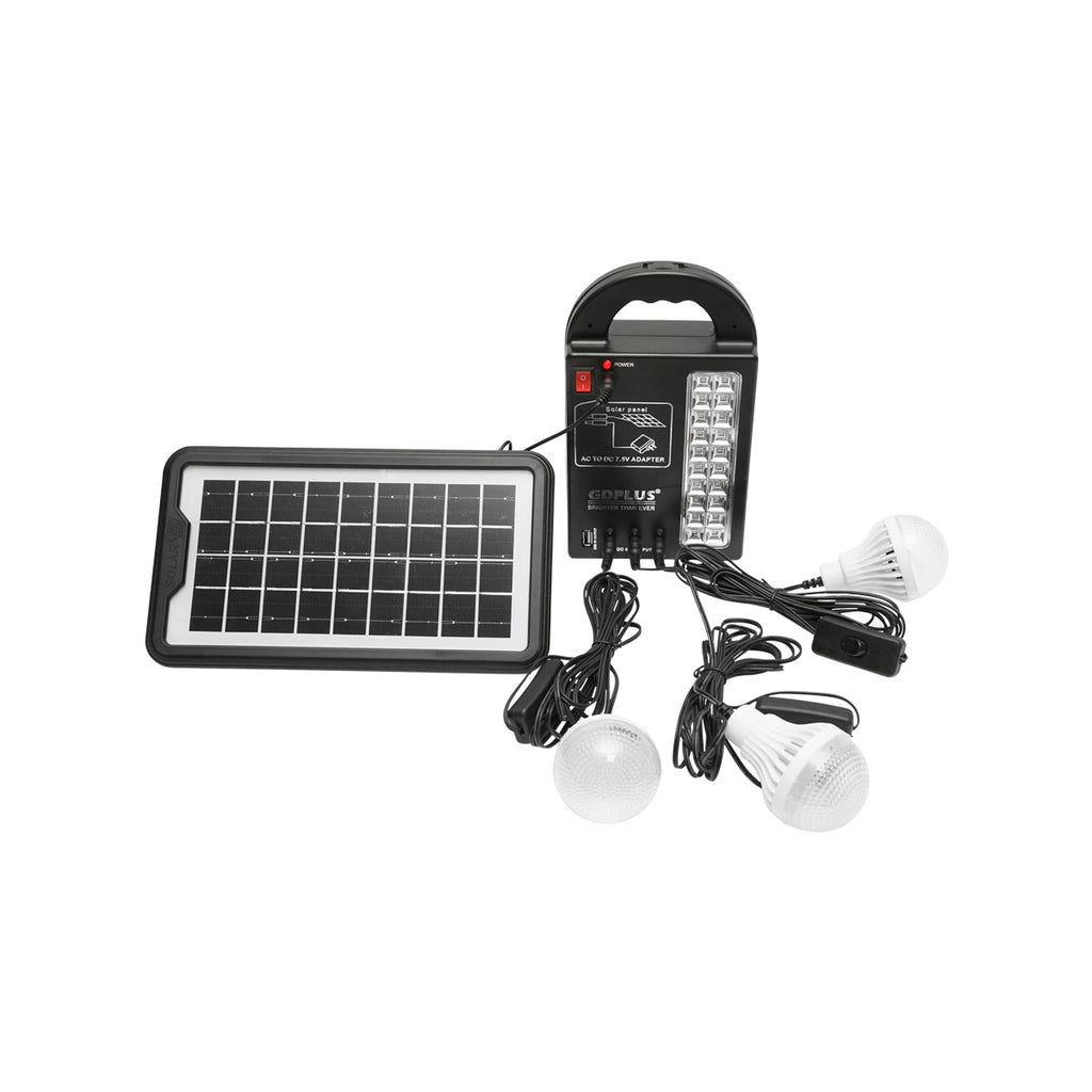 HORDOZHATÓ LED VILÁGÍTÁSI KÉSZLET 3 IZZÓVAL/PROJEKTORRAL, NAPELEMMEL ÉS 6V, 3AH AKKUMULÁTORRAL, HORGÁSZATHOZ, KEMPINGEZÉSHEZ, GD-17 hordozható világítókészlet, amely kempingezéshez és szabadtéri tevékenységekhez használható. A rendszer három darab LED izzót és egy LED reflektort tartalmaz, melyeket egy 3 W teljesítményű, monokristályos napelem és 6 V, 3 Ah kapacitású akkumulátor lát el energiával.