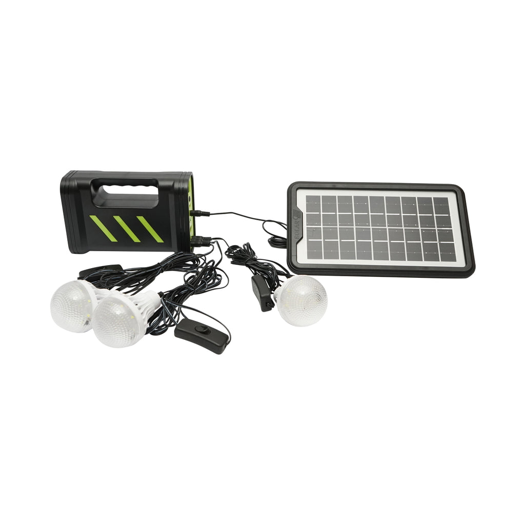 HORDOZHATÓ LED VILÁGÍTÁSI KÉSZLET 3 IZZÓVAL/PROJEKTORRAL, NAPELEMMEL ÉS 6V, 4.5AH AKKUMULÁTORRAL, HORGÁSZATHOZ, KEMPINGEZÉSHEZ, GD-12 hordozható világítási készlet, három darab 90 lumen fényerejű LED-izzóval és egy 150 lumenes LED-projektorral. Monokristályos, 3 W teljesítményű, 5 V-os napelemes panellel működik, a lámpákhoz 4 méteres tápkábel tartozik. Beépített 6 V, 4,5 Ah kapacitású ólom-savas akkumulátorral rendelkezik, USB 5 V kimenettel.
