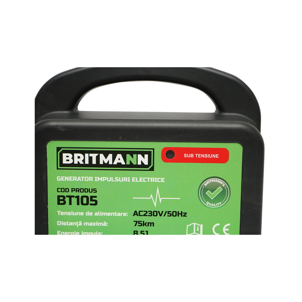 A BRITMANN impulzus generátor hatékony készülék elektromos kerítések üzemeltetésére akár 75 km-es hatótávolságban. Az eszköz 230 V-os váltóáramú táplálással működik, és 8,5 Joule impulzus energiát biztosít, ami megbízható védelmet nyújt a kerítés által körülhatárolt területen.