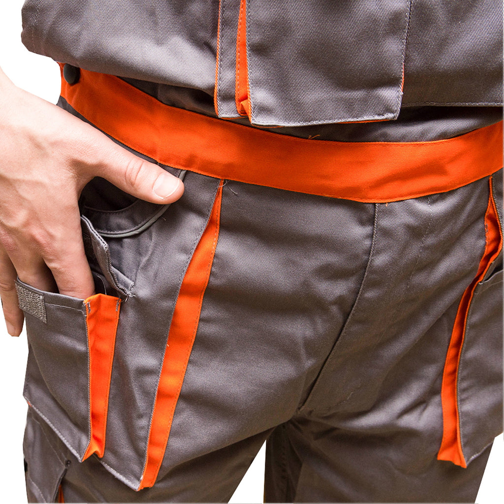 A Breckner Germany kantáros munkaruha strapabíró és kényelmes megoldást kínál a mindennapi fizikai munkát végzők számára. A szürke és narancssárga színek jól láthatóvá teszik a viselőjét, miközben modern megjelenést is biztosítanak. Az állítható vállpántok, valamint a jól elhelyezett zsebek fokozzák a munkaruha praktikusságát. A 235 g/m² sűrűségű kevertszálas anyag – 65% poliészter és 35% pamut – kiválóan ellenáll a kopásnak, ugyanakkor megfelelő szellőzést és kényelmet nyújt. Az 54-es méret különösen alkalmas a nagyobb testalkatú felhasználók számára.