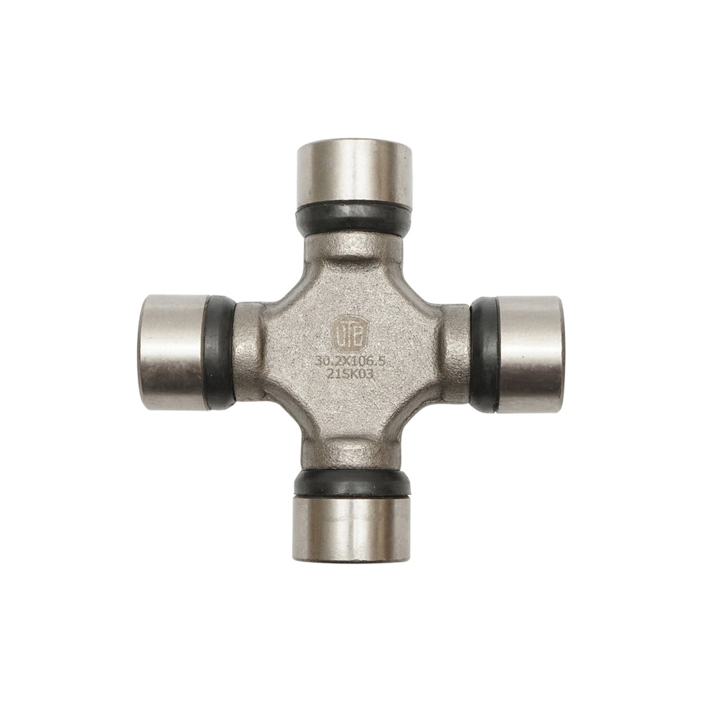KARDÁNKERESZT T7, 30,2X106,5 MM, ZSÍRZÓSZEMMEL ÉS RÖGZÍTŐBIZTOSÍTÓKKAL kardáncsukló, amely a hajtótengelyek forgatónyomatékát továbbítja szögeltérések esetén is. A csukló 30,2 mm átmérőjű és 106,5 mm hosszúságú, zsírzószemmel (gresor) és biztosítógyűrűkkel felszerelve. Kompatibilis T7 sorozatú kardánokkal.