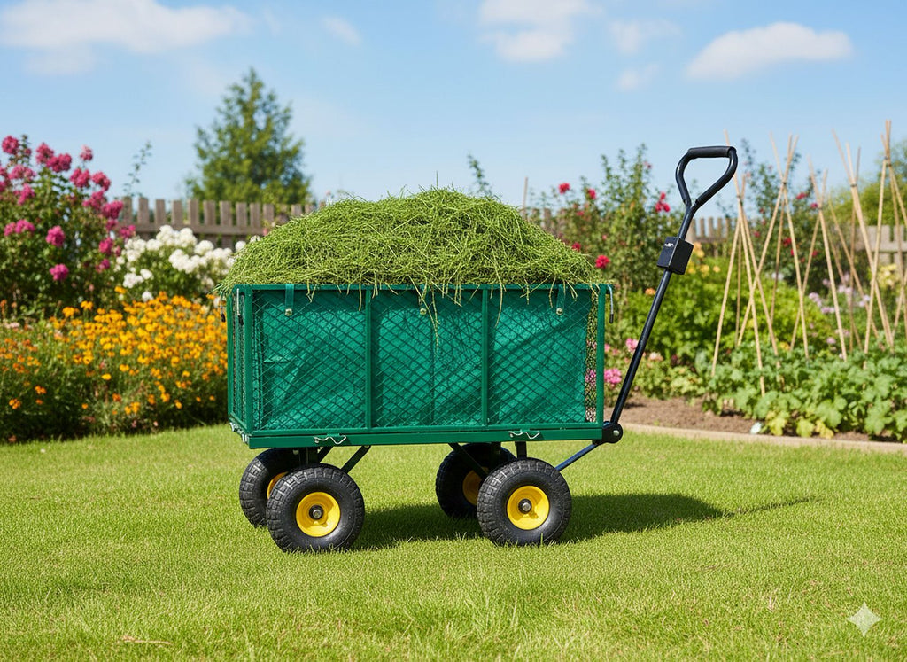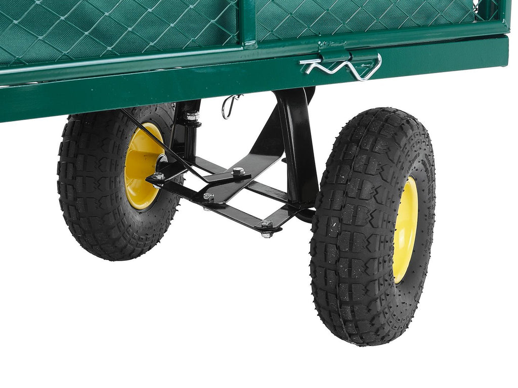 A kocsi 10 col átmérőjű, felfújható gumikerékkel van felszerelve, az első kerekek forgathatók, így kiváló manőverezhetőséget biztosítanak. A fogantyú ergonomikus kialakítású, csúszásmentes borítással. A kerti kocsi textil béléssel együtt kerül szállításra, amely lehetővé teszi ömlesztett anyagok, például föld, homok vagy levelek szállítását.