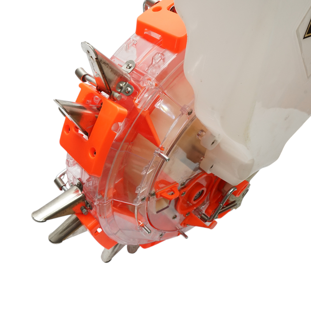 A KÉZI VETŐGÉP, 7 TÜSKÉVEL, 8 CM VETÉSI MÉLYSÉGGEL, 4 LITERES MAGTARTÁLLYAL, 12 LITERES MŰTRÁGYATARTÁLLYAL – THOR kézi vetőgép hét darab vetőfoggal rendelkezik, amelyek gyors és egyenletes vetést biztosítanak különböző szántóföldi kultúrák esetén. A vetési mélység legfeljebb 8 cm-ig állítható. A magtartály 4 literes, áttetsző kialakításának köszönhetően a töltöttségi szint könnyen ellenőrizhető. A műtrágyaadagoló tartály térfogata 12 liter, a kijuttatási mennyiség 2–7 gramm között szabályozható menetenként. A vetőgép körönként 1–3 mag kijuttatására alkalmas, a használt növénykultúrától függően. Maximális teljesítménye akár 0,2 hektár óránként. A hátsó tömörítő henger gondoskodik a talaj lezárásáról a vetés után. A szerkezet sík, enyhén dombos vagy mérsékelten nedves talajokon is használható.