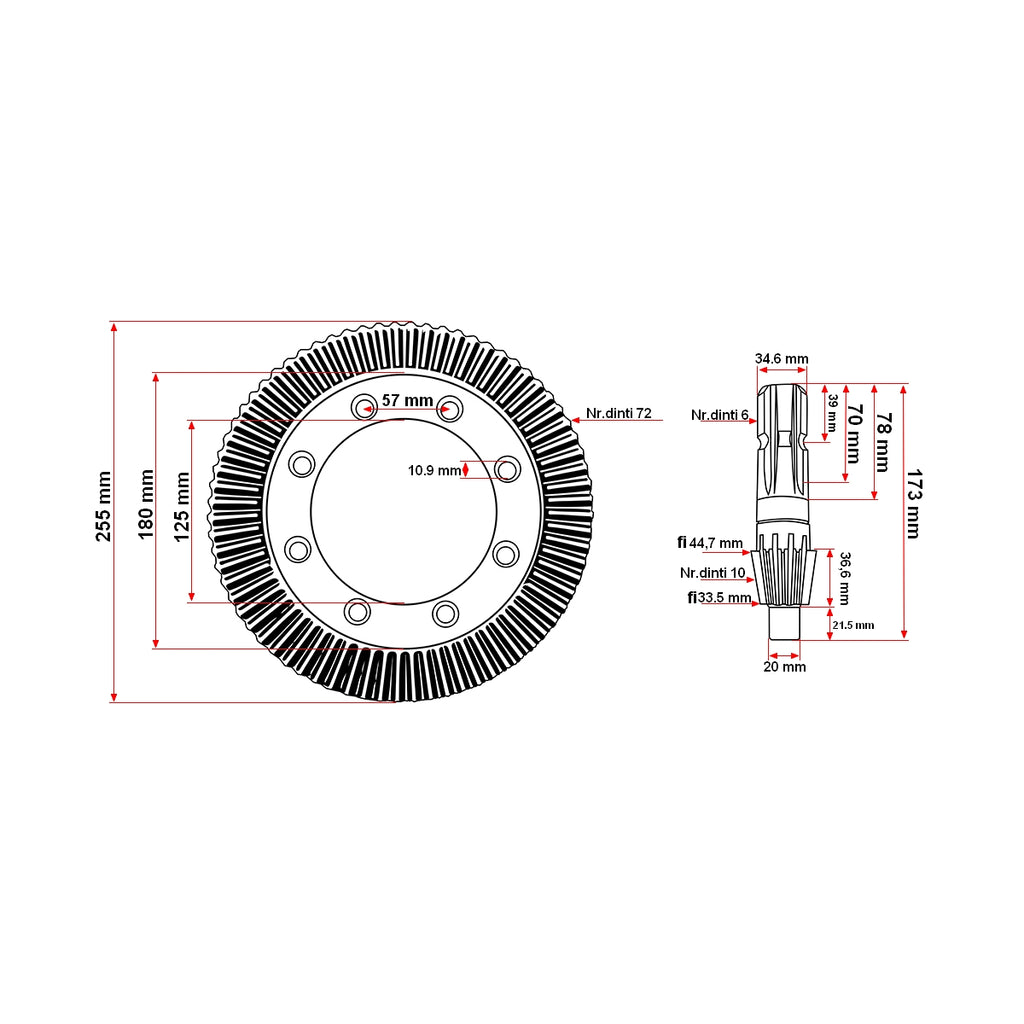 A KÚPFOGASKERÉK-KÉSZLET (COMER Z72/Z10 M3.55) MASCHIO GASPARDO GOLIA GEREBLYÉHEZ, SOROZAT: 250–300/330/380/410, KORONAKERÉK: 0.792.6000.00, KÚPFOGASKERÉK: 0.792.5000.00 kúpfogaskerekes hajtás Maschio Gaspardo Golia szériás rendsodrókhoz használható. A hajtás áttételi aránya 3,55. A koronakerék cikkszáma 0.792.6000.00, a pinioné 0.792.5000.00.