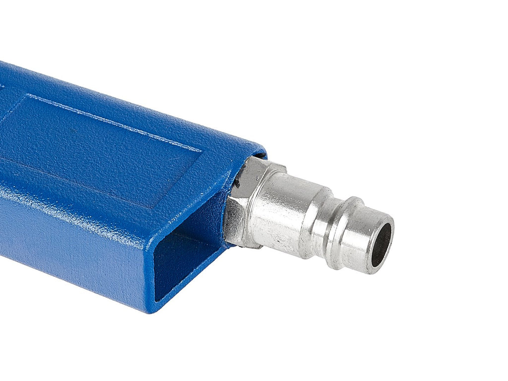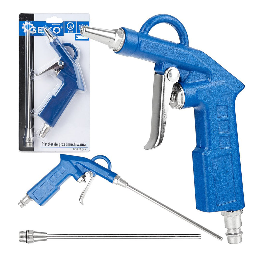 Ez a LÉGFÚVÓ PISZTOLY 2 FÚVÓKÁVAL GEKO két cserélhető fúvókával rendelkezik. A rövid fúvóka pontos és helyi fújásra alkalmas, míg a 20 cm-es hosszú fúvóka megkönnyíti a nehezebben hozzáférhető helyek elérését. A megengedett maximális nyomás 8 bar. A szabványos 1/4"-os levegőbemenet kompatibilissé teszi a legtöbb elérhető kompresszorral.