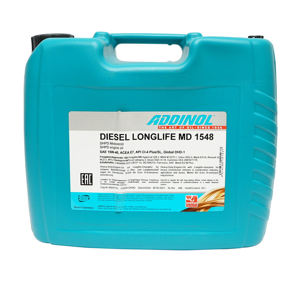 LONGLIFE MD1548 15W40 MOTOROLAJ, 20L, ADDINOL, DÍZELMOTOROKHOZ olyan kenőanyag, amely tehergépkocsik, ipari, mezőgazdasági, erdészeti és építőipari járművek, valamint autóbuszok dízelmotorjaihoz használható a megadott megnevezés alapján. A termék a motor alkatrészeinek kenésére szolgál, és a felsorolt műszaki követelményeknek megfelelő tulajdonságokkal rendelkezik. A megadott jellemzők között szerepel a koromképződés kontrolljához kapcsolódó működés, a termo-oxidációs stabilitás és a megadott emissziós szinthez szükséges követelmények teljesítése. A felsorolásban szereplő szabványok és jóváhagyások határozzák meg a kompatibilitási kört.
