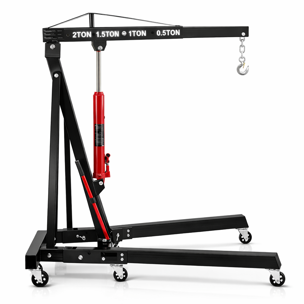 ÖSSZECSUKHATÓ MOTORKIEMELŐ ZSIRÁF 2 T REDATS 3 mm vastag zárt profilokból épül fel. A maximális teherbírás 2 tonna. A kar négy fokozatban állítható, 500 kg, 1 tonna, 1,5 tonna és 2 tonna.