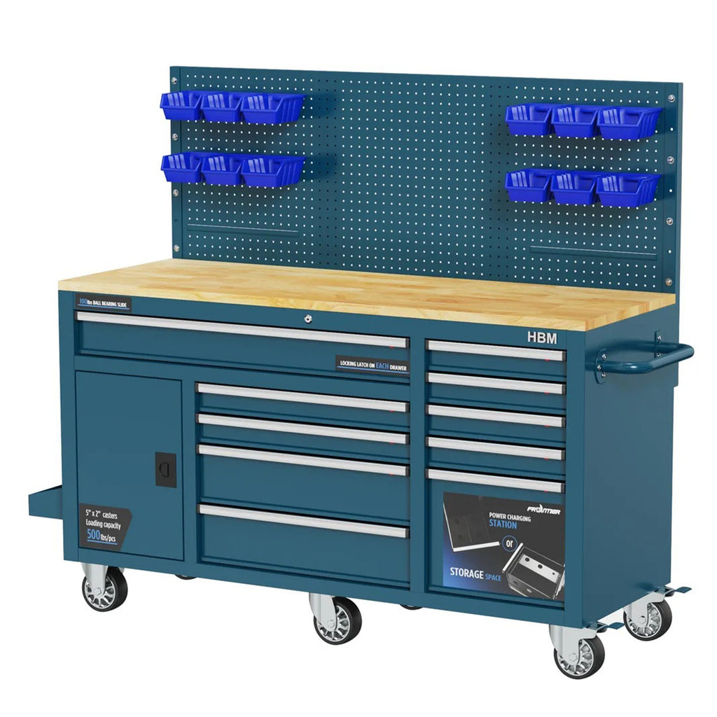 Ez a MUNKAASZTAL – MUNKAPAD SZERSZÁMTARTÓ HÁTLAPPAL KEMÉNYFA MUNKALAPPAL 158 CM HBM KÉK szerszámok megmunkálására és tárolására alkalmas termék. A pad könnyen szállítható a vele felszerelt kerekeknek, melyek közül 4 forgatható és 2 fékes, valamint az acél fogantyúnak köszönhetően. A munkalap 3 cm vastag tömörfából készült. Több fiók is van, melyek külön zárhatók. A bal oldalon 3 nagy fiók található, dupla vezetőkkel. Összesen 12 tároló fiók található.