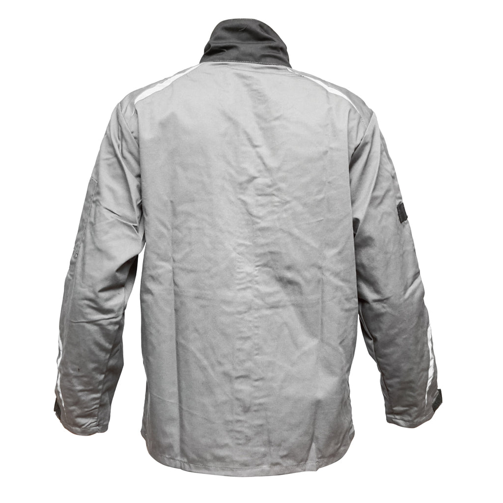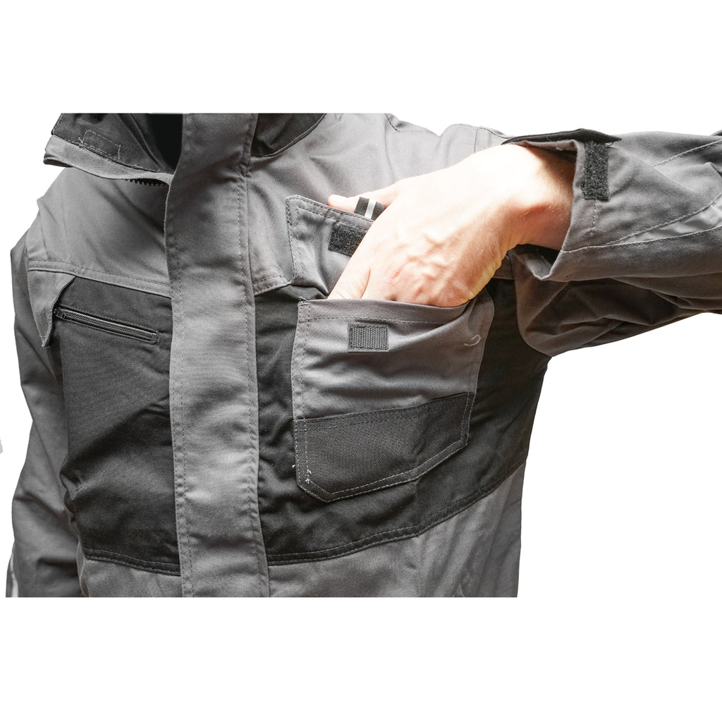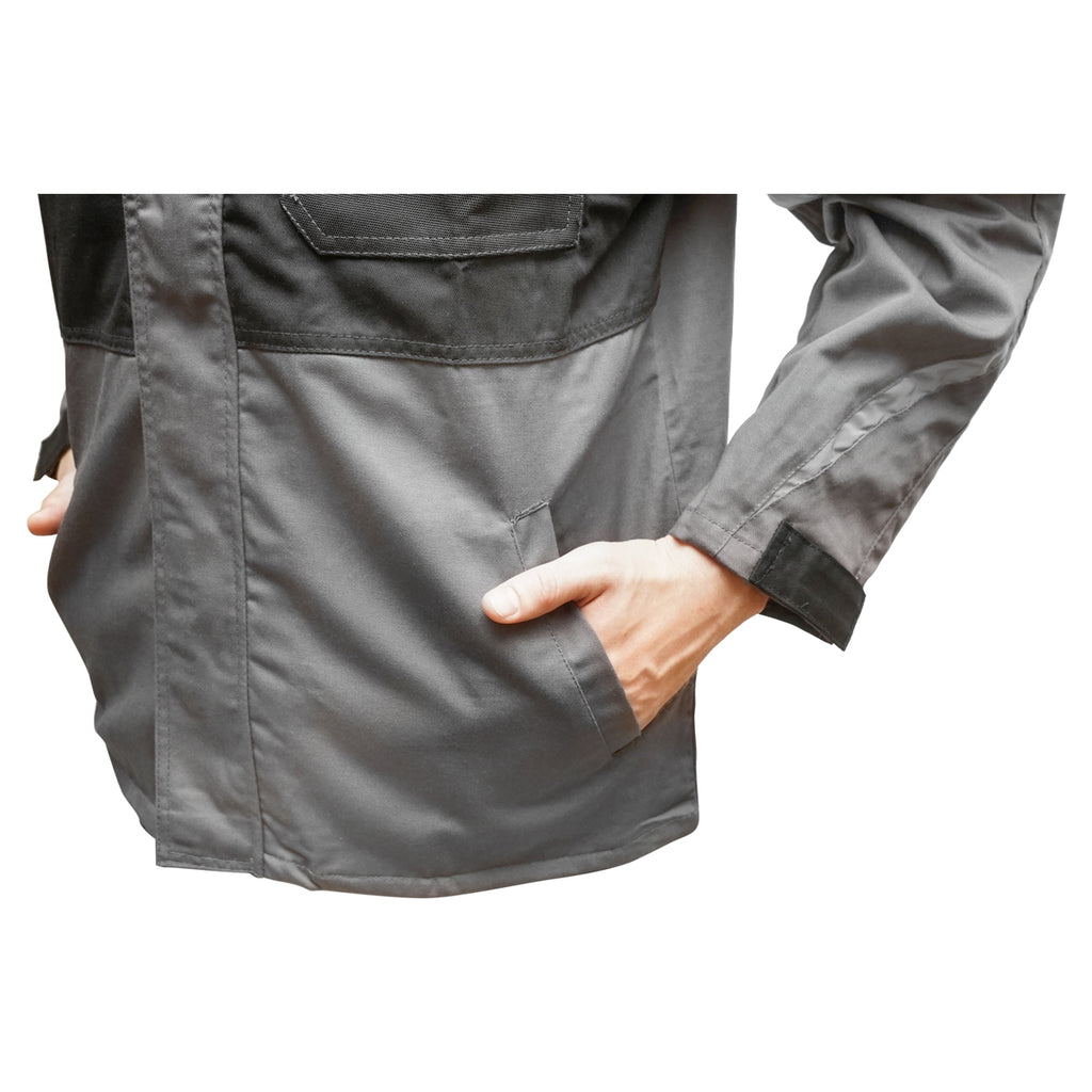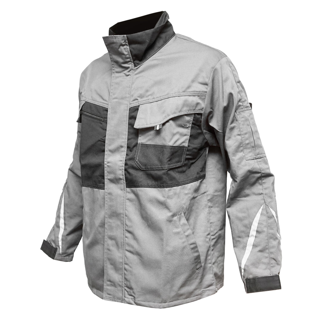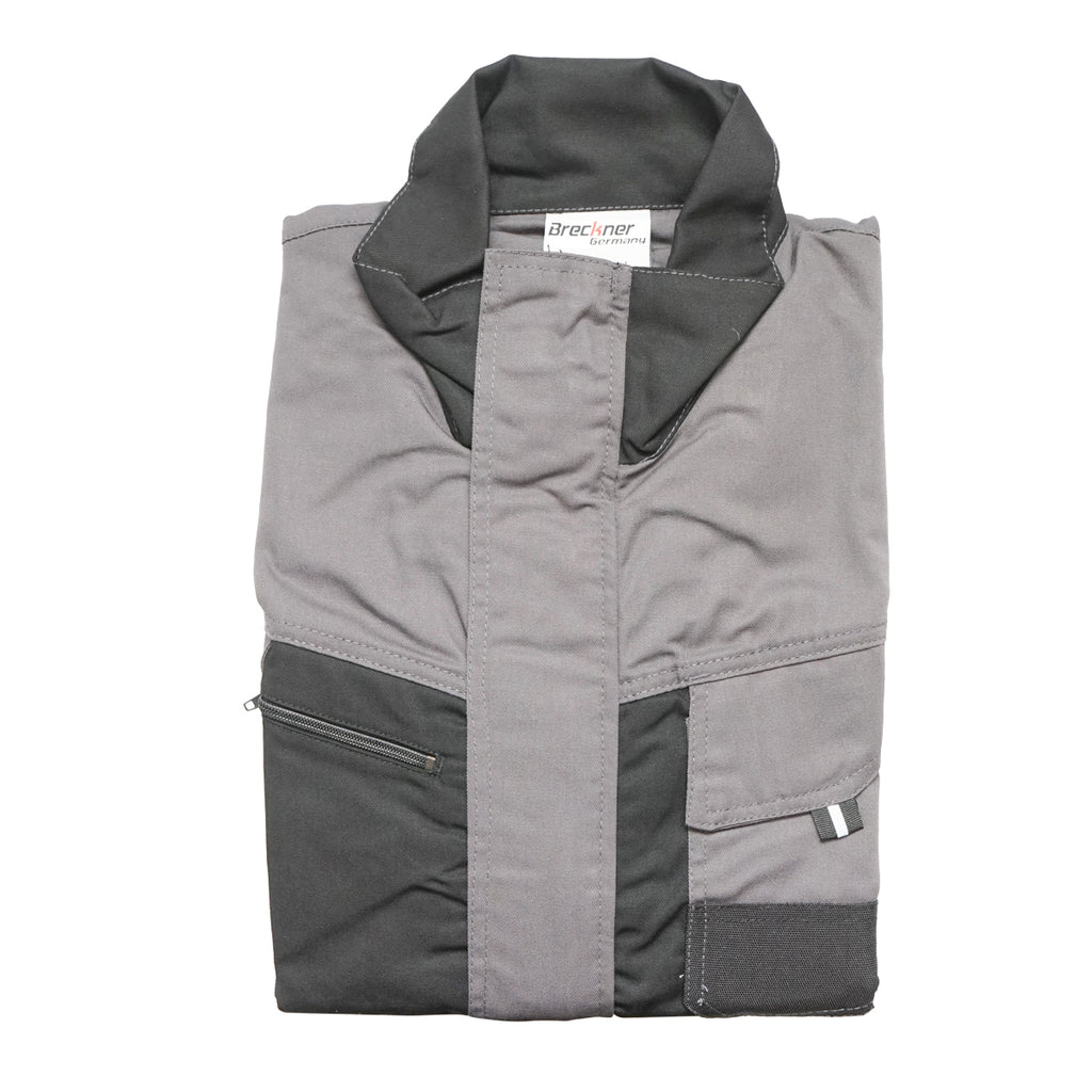 MUNKADZSEKI POLIÉSZTER ÉS PAMUT KEVERÉKBŐL, SZÜRKE-FEKETE, S MÉRET, BRECKNER GERMANY munkavégzésre tervezett kabát, amely 35% pamut és 65% poliészter keverékéből készült. Anyagsűrűsége 245 g/m², színe gri és negru kombinációja, mérete S.