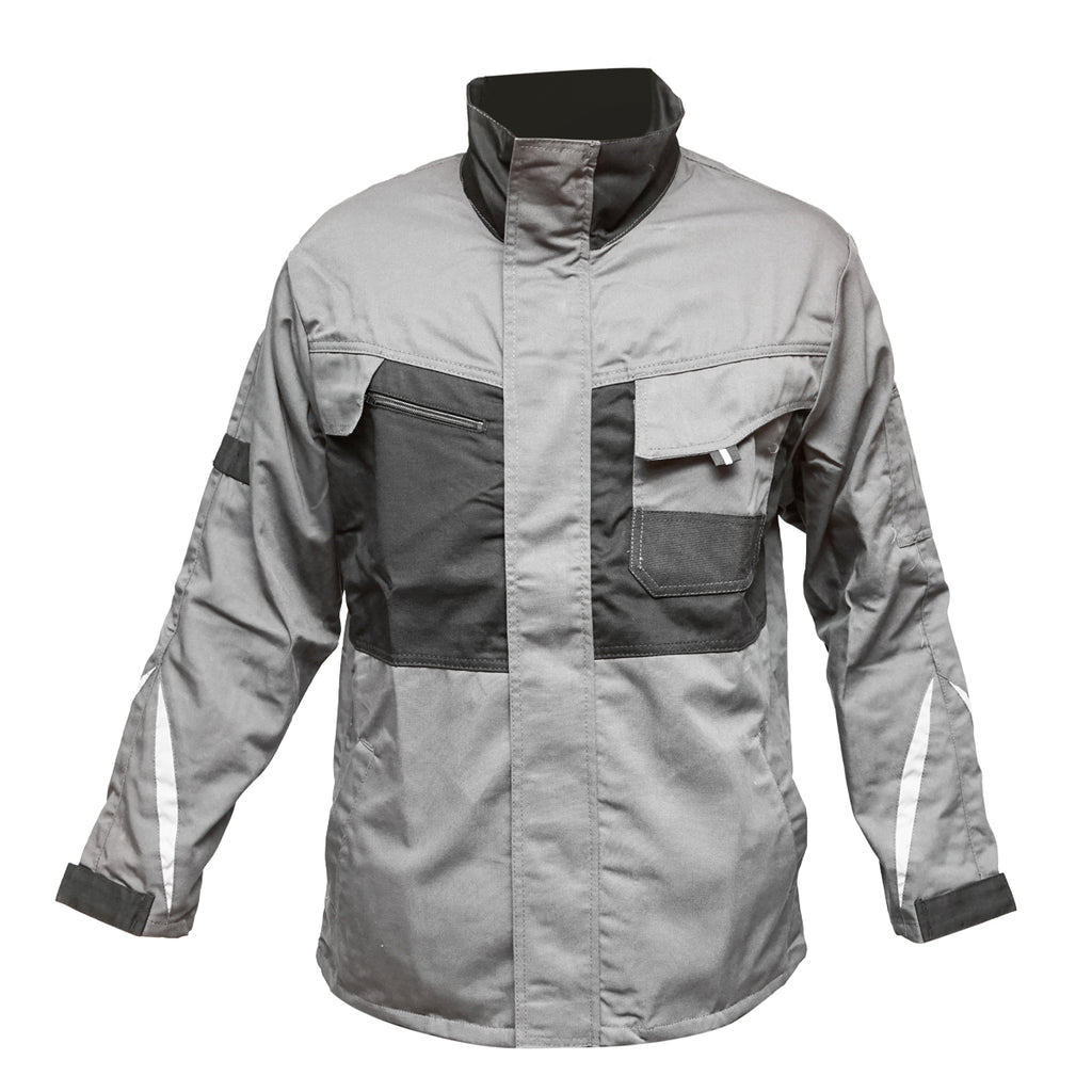 MUNKADZSEKI POLIÉSZTER ÉS PAMUT KEVERÉKBŐL, SZÜRKE-FEKETE, XL MÉRET, BRECKNER GERMANY strapabíró munkaruha, amely 35% pamutból és 65% poliészterből készült. Anyagának sűrűsége 245 g/m², színe szürke és fekete kombinációja. A termék mérete XL.