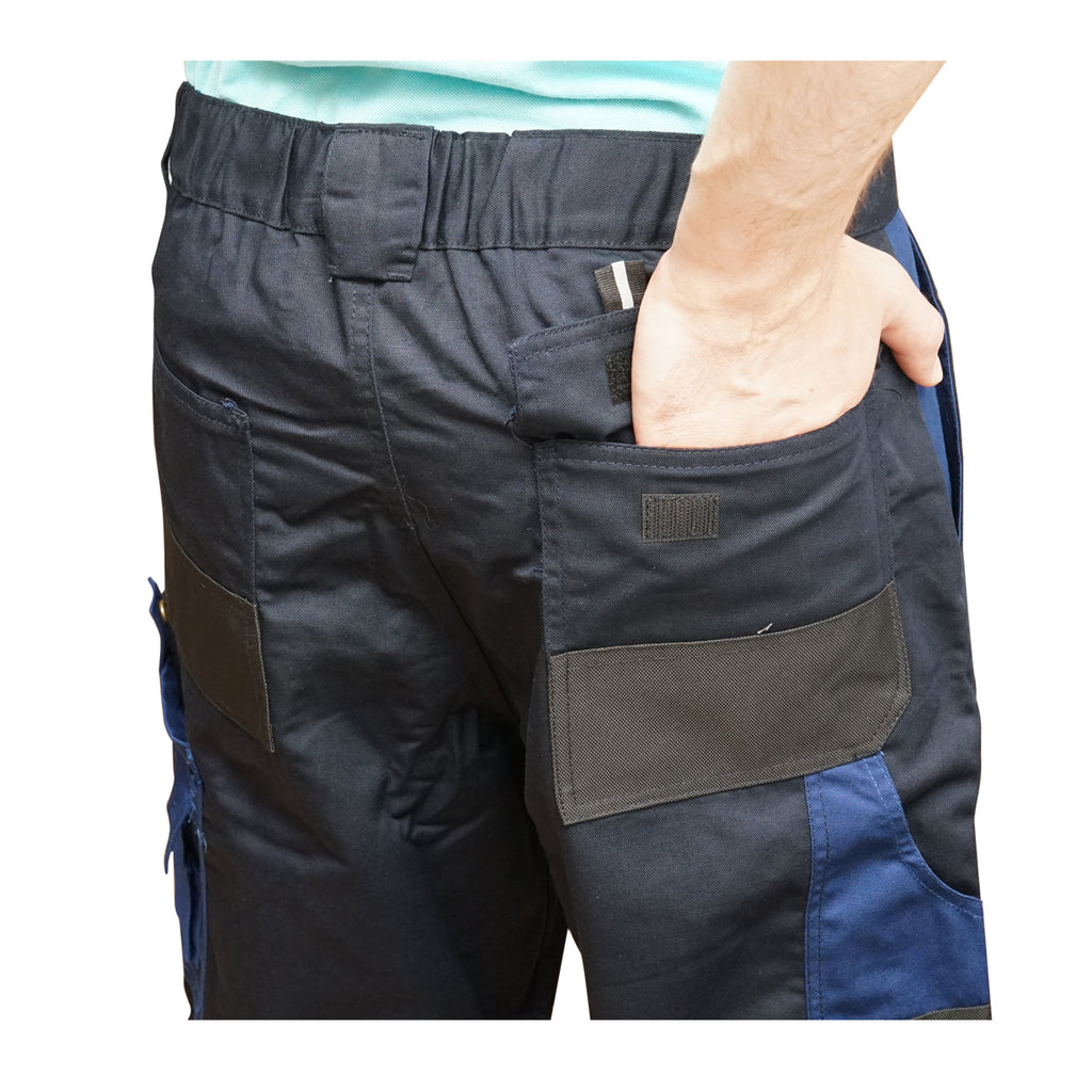 MUNKANADRÁG POLIÉSZTER ÉS PAMUT KEVERÉKBŐL, SÖTÉTKÉK (NAVY), M MÉRET, BRECKNER GERMANY munkavégzésre tervezett, pamut és poliészter keverékéből készült nadrág. Anyagösszetétele 35% pamut és 65% poliészter, sűrűsége 245 g/m². Színe albastru navy és albastru royal kombinációja, mérete M.