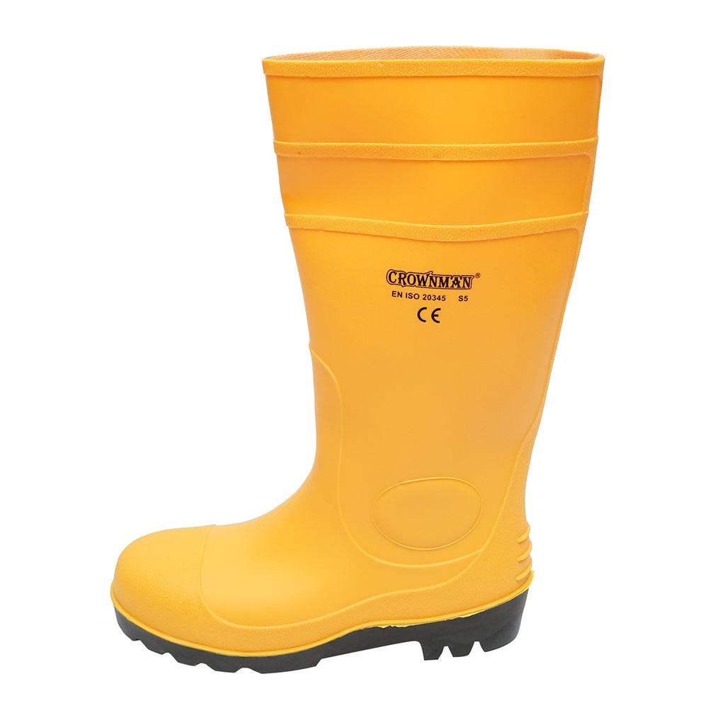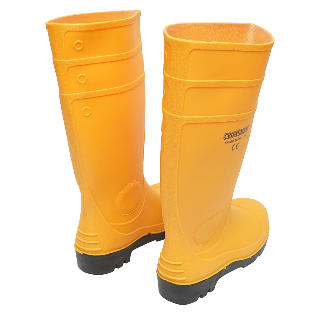 MUNKAVÉDELMI GUMICSIZMA, SÁRGA, 45-ÖS MÉRET, CROWNMAN vízálló gumiból készült, sárga színű lábbeli. A modell mérete 45, kialakítása munkakörnyezetben történő használatra alkalmas.