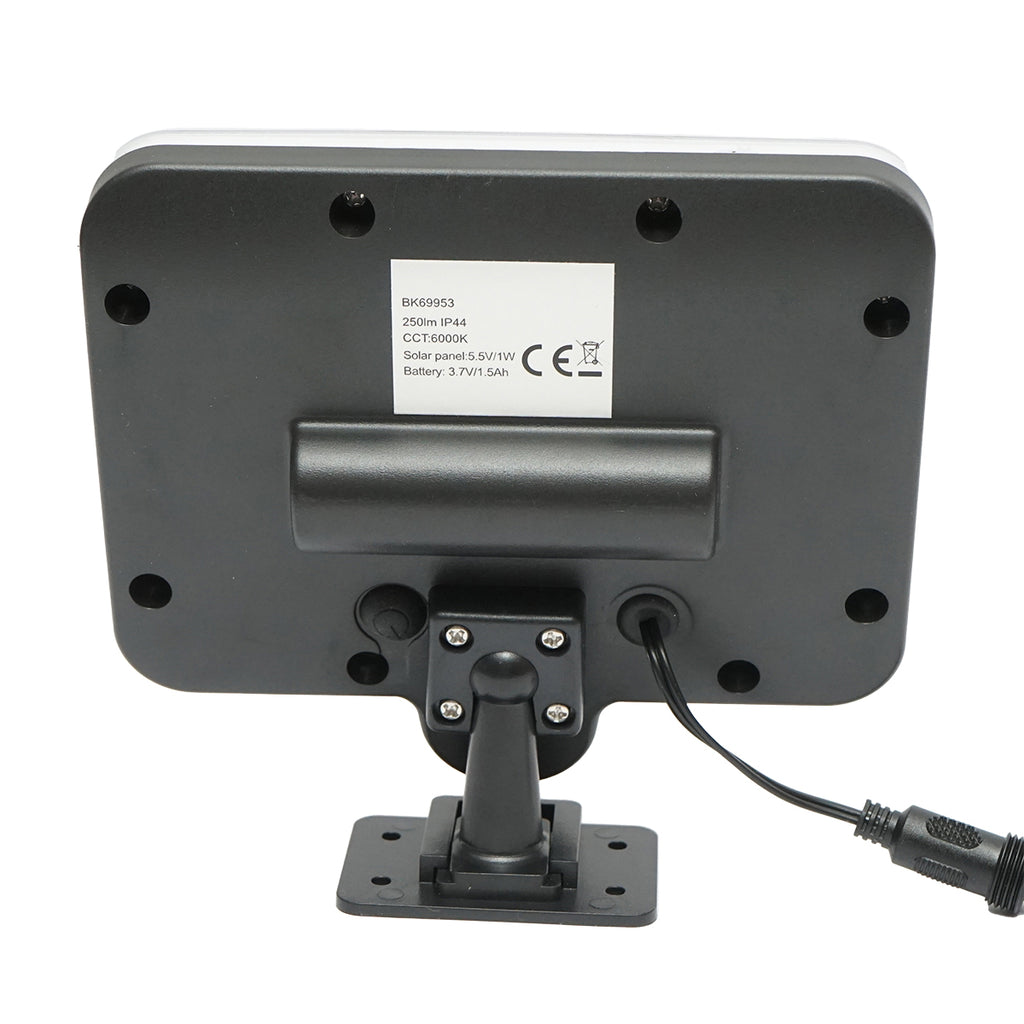 NAPELEMES LED LÁMPA 250 LM, 1W / 5.5V NAPELEMMEL, 3.7V / 1.5 AH AKKUMULÁTORRAL, TÁVIRÁNYÍTÓVAL, 5 M KÁBELLEL ÉS MOZGÁSÉRZÉKELŐVEL, IP44, BRECKNER GERMANY napenergiával működő világítótest. A fényárama 250 lumen, a színhőmérséklete 6000K. A működését 3.7V/1.5 Ah kapacitású akkumulátor biztosítja, amelyet 1W/5.5V teljesítményű napelem tölt. A lámpa 5 méteres kábellel, távirányítóval és mozgásérzékelővel rendelkezik. A felszerelési magassága 1,8–2,5 m, védettségi besorolása IP44. Az üzemi hőmérséklet -5 és +60 °C között van.