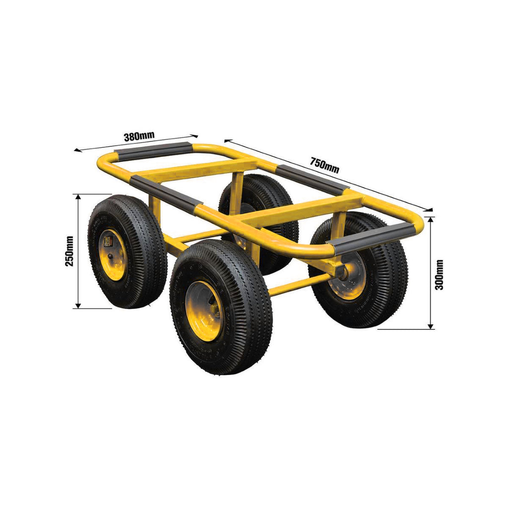 NÉGYKEREKŰ FÉM SZÁLLÍTÓKOCSI PNEUMATIKUS KEREKEKKEL, 750×380 MM, 250 MM ÁTMÉRŐJŰ KEREKEKKEL fémvázas kézikocsi, amely pneumatikus kerekekkel van felszerelve a könnyebb mozgathatóság érdekében. A kocsi váza 750 x 380 mm méretű, teljes magassága 300 mm. Maximális terhelhetősége 250 kg, saját tömege pedig 11,2 kg.