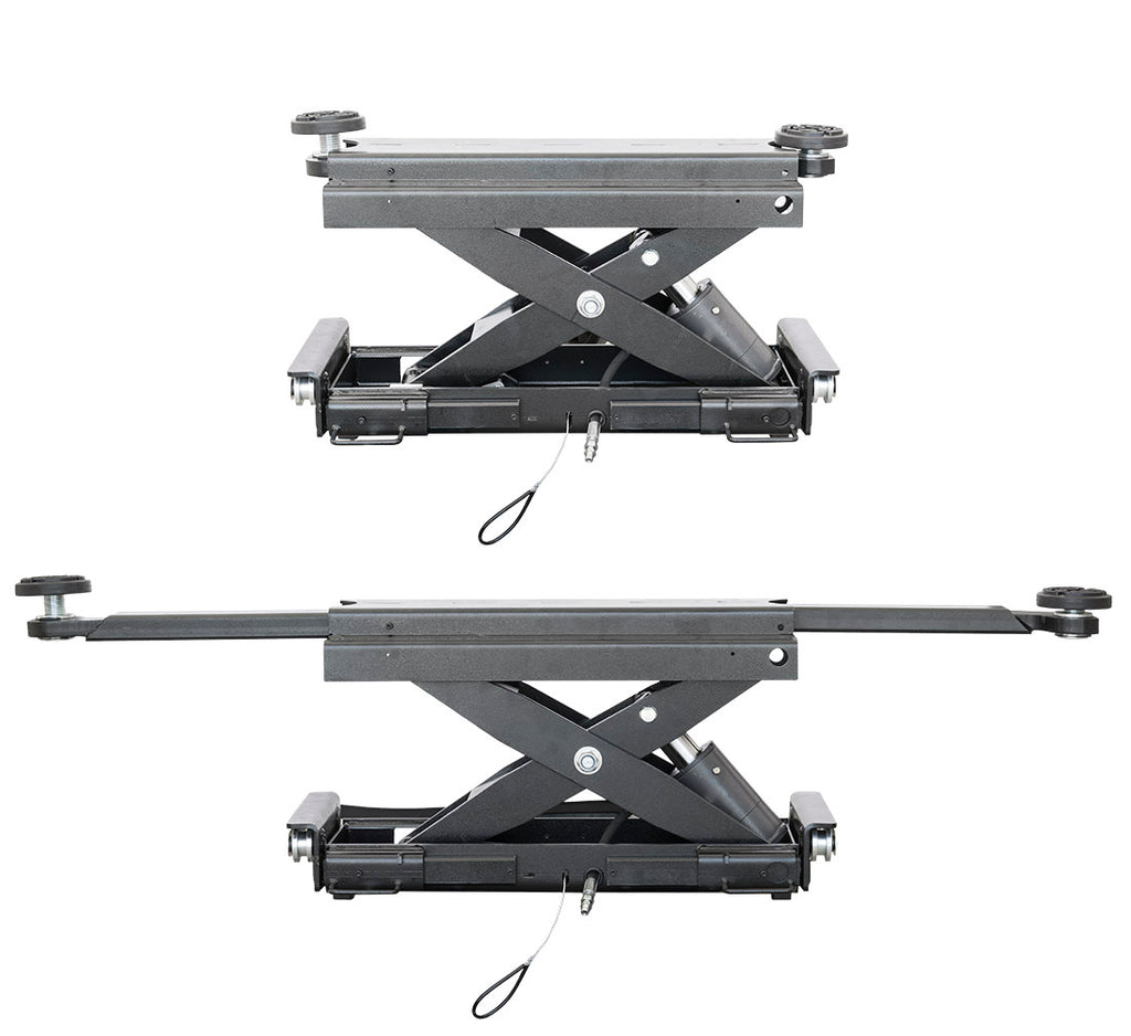 A kezelés a kezelőpanelen vagy a vezetékes távirányítón keresztül történik, mindkettő gyors hozzáférést biztosít az emelő vagy süllyesztő kezelőszervekhez. A platformok csúszásgátló felületekkel, gördülésgátló zárakkal és fedelekkel vannak felszerelve a forgó platformok behelyezéséhez vagy letakarásához a kerékkiegyenesítéshez. A biztonságot racsnis rendszerek, hidraulikus túlnyomásszelep, kábelszakadás elleni védelem és 24 V-os kisfeszültségű tápellátás biztosítja az elektromos vezérléshez.
