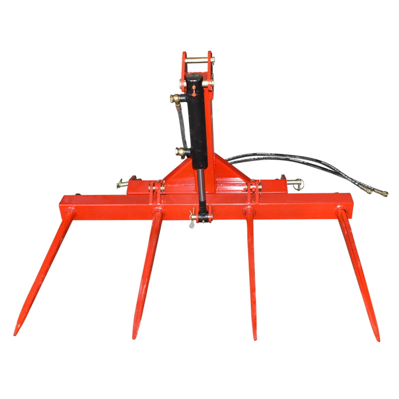 NÉGYTÜSKÉS HIDRAULIKUS BÁLAVILLA 250 KG TEHERBÍRÁSSAL, 800 MM-ES TÜSKÉVEL hidraulikus működtetésű rakodószerszám, amely mezőgazdasági gépekre szerelhető. Négy darab, egyenként 800 mm hosszú tüskével rendelkezik, amelyek szénabálák emelésére és mozgatására alkalmasak. A maximálisan kezelhető bála tömege 250 kg.