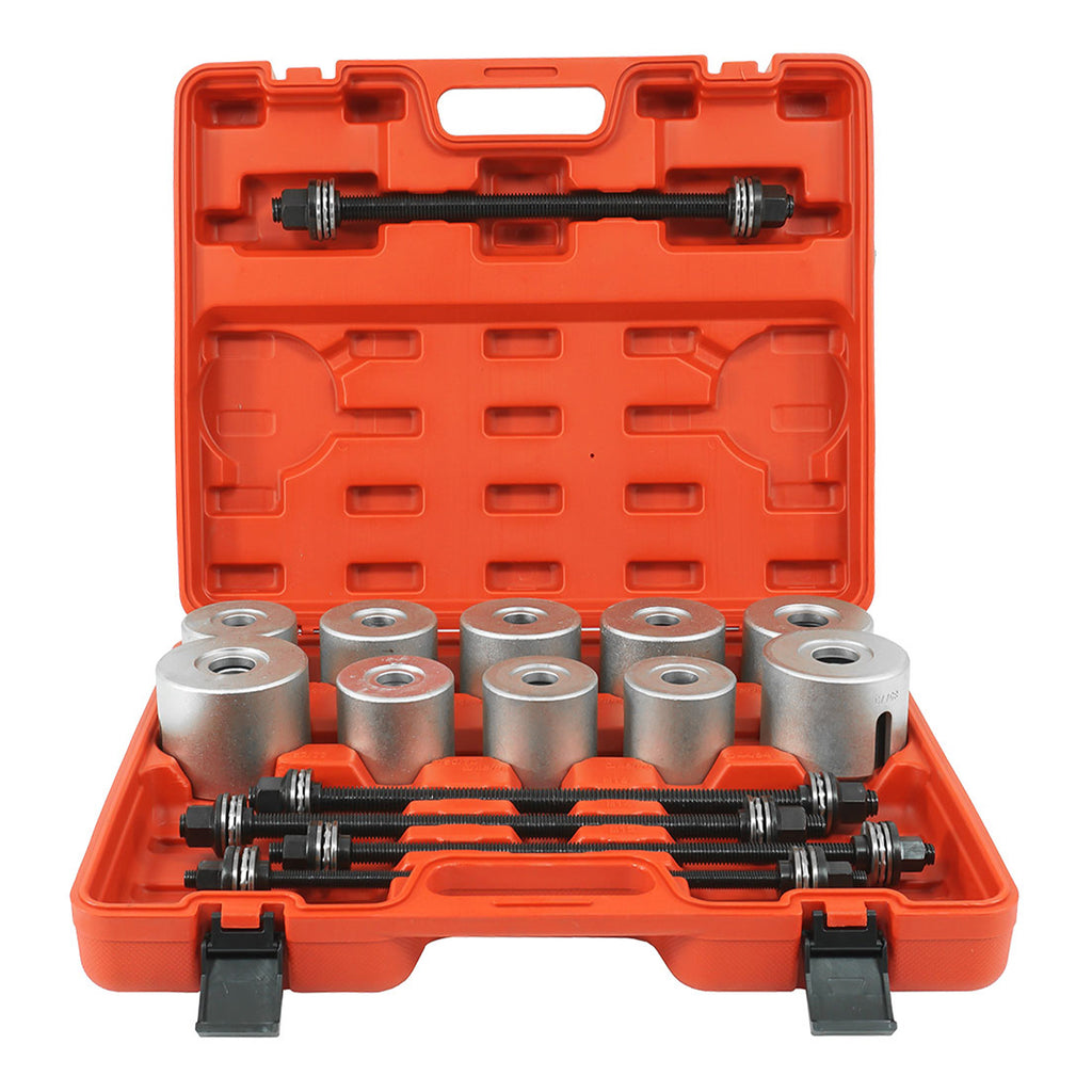 PRESS KIT KIVEZETT ÉS FELSZERELT FELFÜGGESZTÉS PEREKEK ÉS CSAPÁGYOK, SILENT BLOCK 27 DARBOS egy professzionális készlet, amely 27 részből áll, az autó felfüggesztési rendszerek karbantartási és javítási munkáinak megkönnyítésére készült.