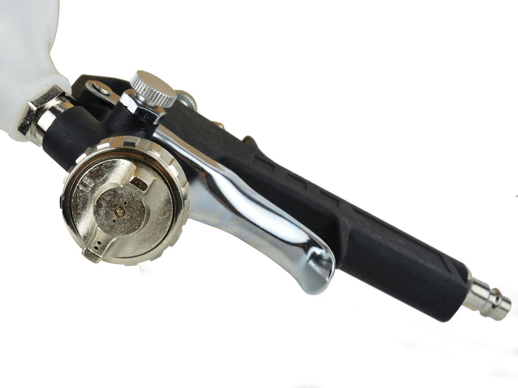 A gravitációs adagolású festékszóró pisztoly 1,5 mm-es standard fúvókával, levegő- és festékmennyiség-szabályozással, alumínium házzal, 600 ml-es tartállyal, 3–5 bar üzemi nyomással és 1/4" BSP gyorscsatlakozóval rendelkezik.