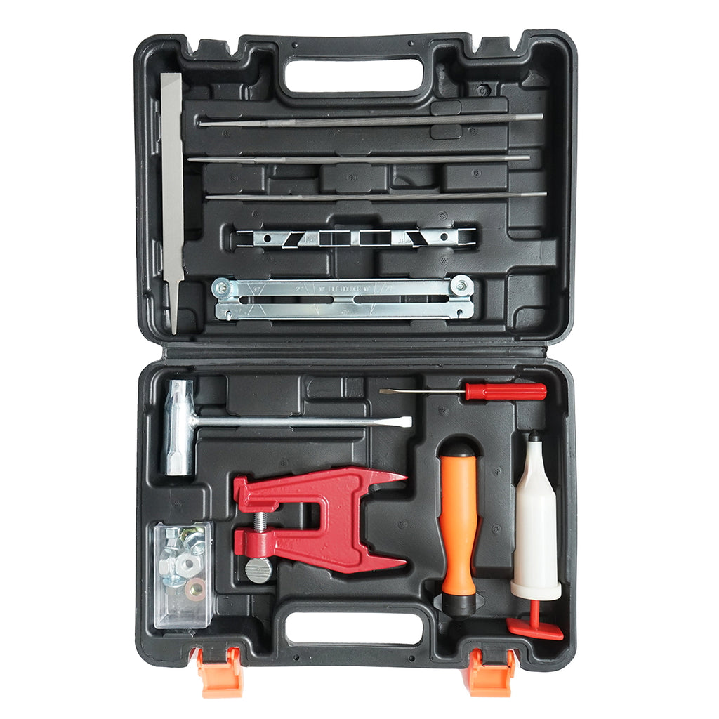 PROFESSZIONÁLIS LÁNCFŰRÉSZLÁNC-ÉLEZŐ KÉSZLET, 12 DARABOS láncfűrész láncélező készlet, amely a lánc karbantartásához és élezéséhez szükséges kéziszerszámokat tartalmazza. A készletben többféle átmérőjű kerek reszelő, lapos reszelő, sablonok, gyújtógyertya kulcs, valamint egyéb kiegészítők találhatók.