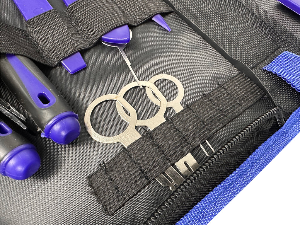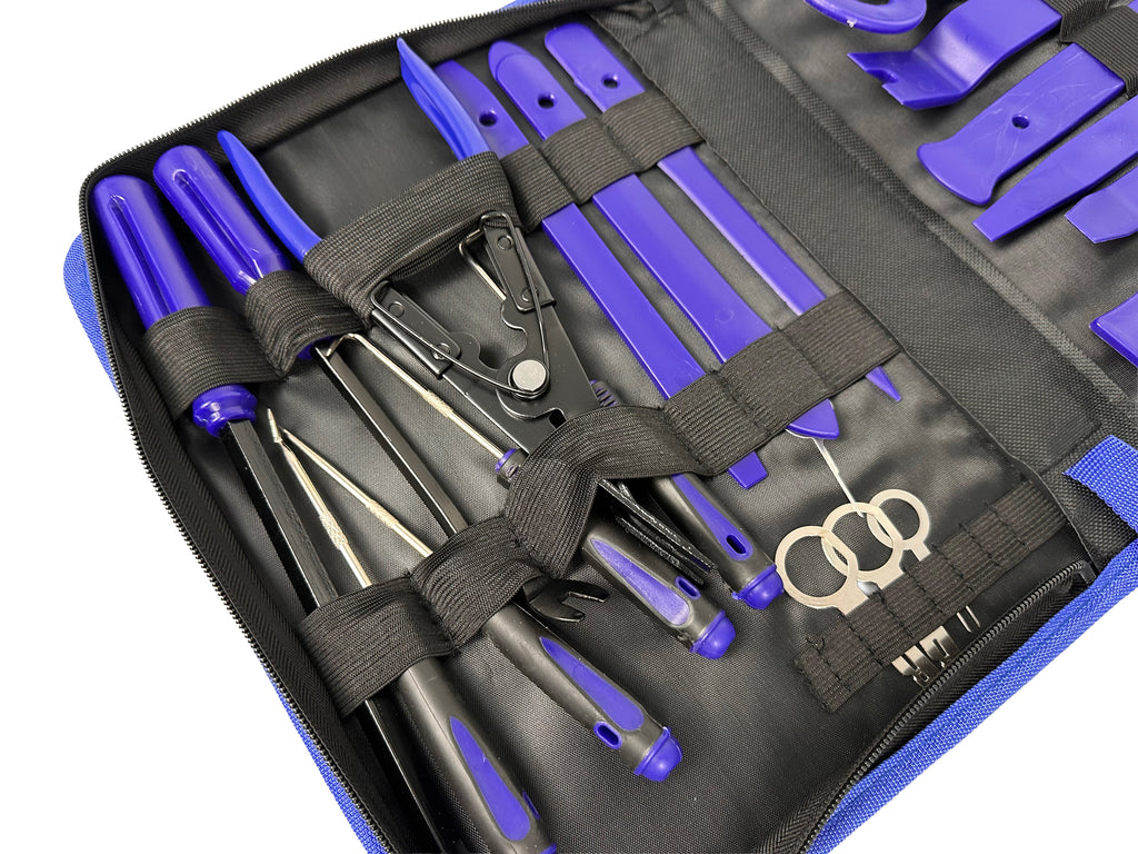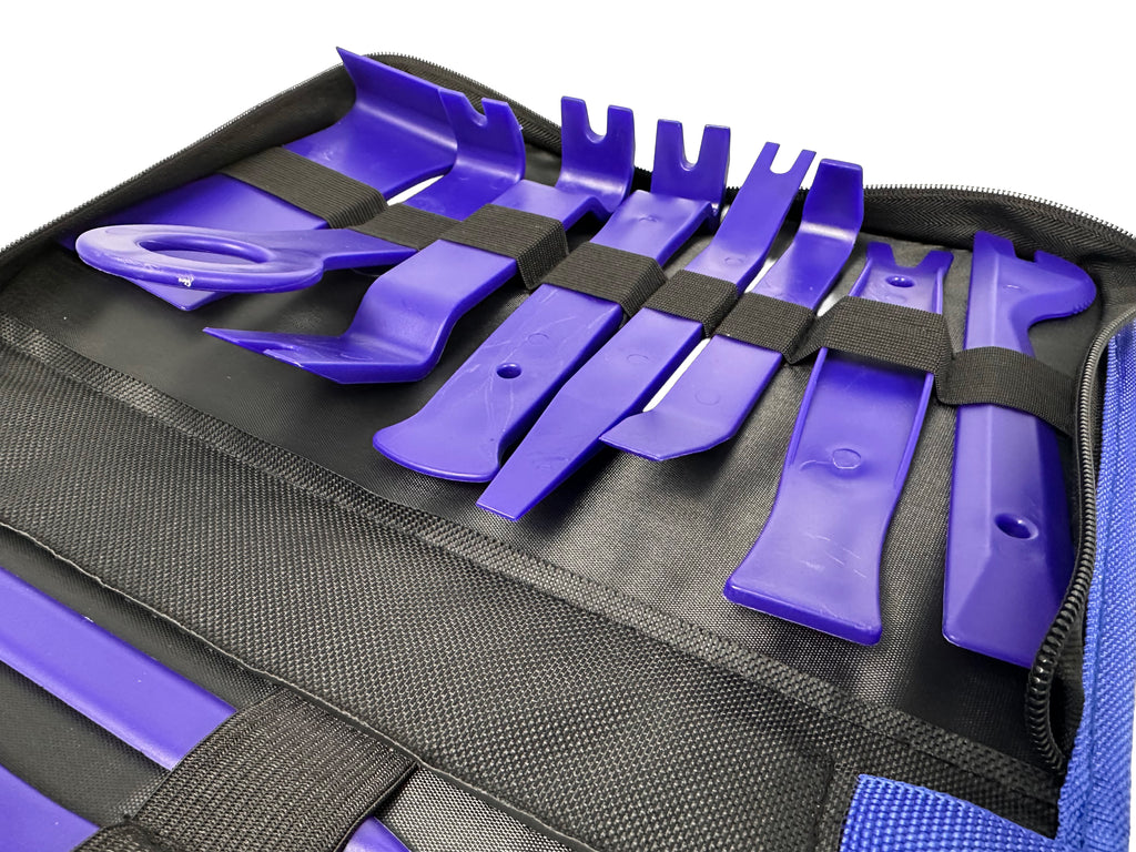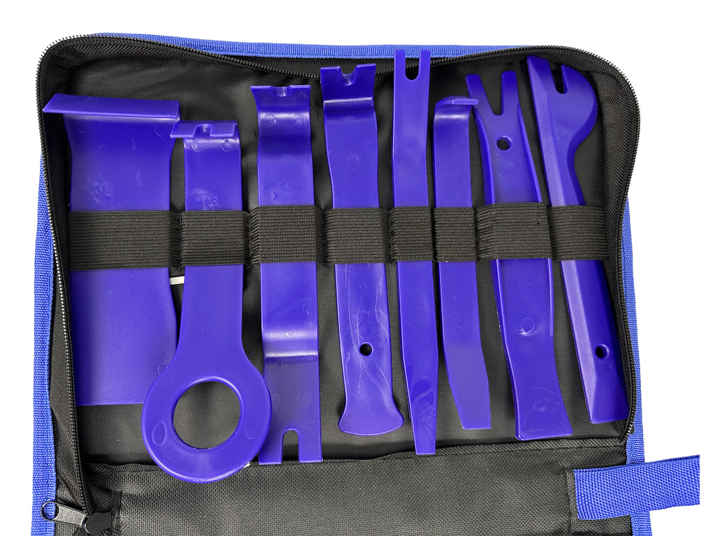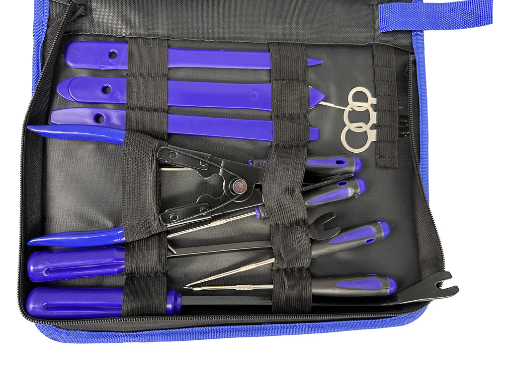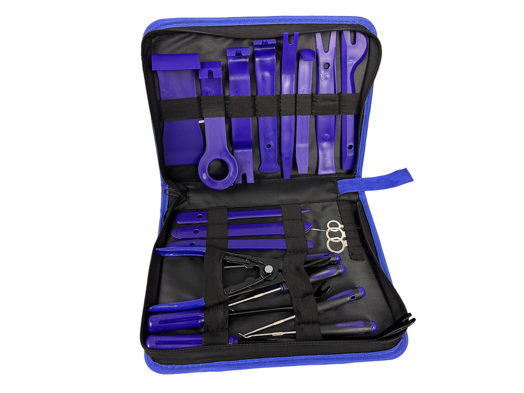 Ez a RÁDIÓSZERELŐ KÉSZLET 23 DB alkalmas panelek, díszlécek, kapcsolók, tükörlencsék és burkolatok eltávolítására. Különösen hasznos nehezen hozzáférhető helyeken végzett munkákhoz.