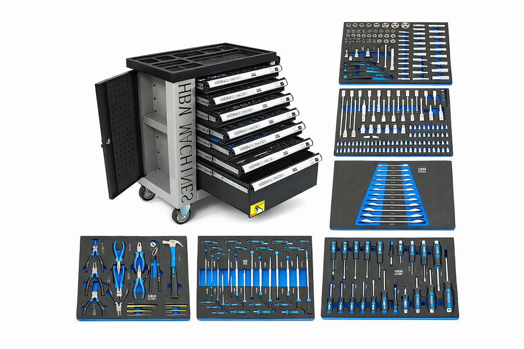 PROFESSZIONÁLIS FELSZERELT SZERSZÁMOS KOCSI – SZERSZÁMOS SZEKRÉNY HBM 7 FIÓKKAL, 245 DARABOS KÉSZLET, 6 SZÉNMODUL – HOLLANDIA, PRÉMIUM