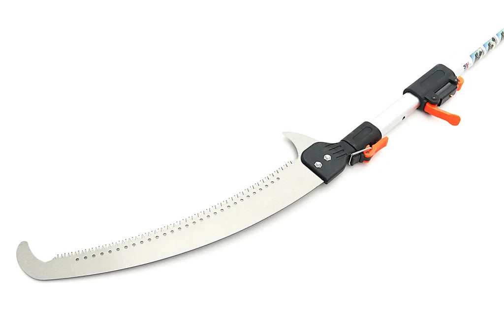 Ez a TELESZKÓPOS NYÉLŰ ÁGFŰRÉSZ 150 - 300 CM magasban történő ágvágásra készült, létra használata nélkül. A penge 50 cm hosszú és 65Mn acélból készült, három oldalán éles fogakkal a hatékony vágás érdekében. A nyél alumíniumból készült, és 1,5 méterről 3 méterre meghosszabbítható, így könnyen hozzáférhet a magas helyekhez. A nyél szigetelt, hogy stabil fogást és kényelmes használatot biztosítson.
