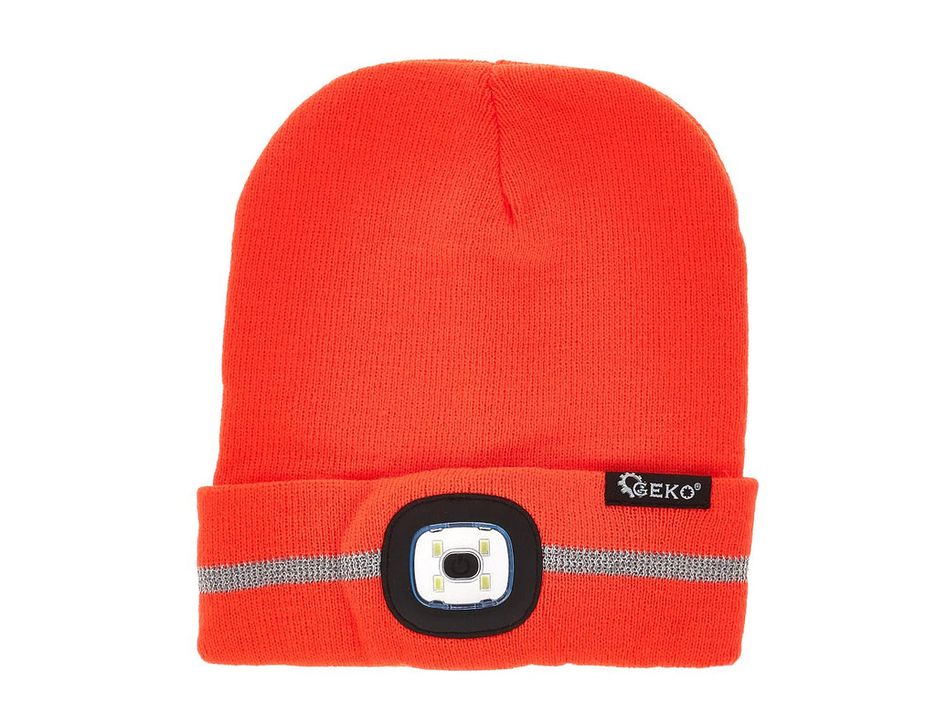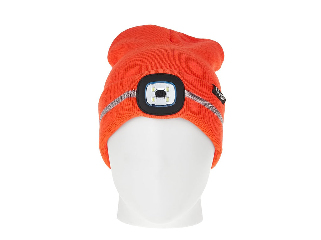 TÉLI SAPKA BEÉPÍTETT ÚJRATÖLTHETŐ LED FEJLÁMPÁVAL, FÉNYVISSZAVERŐ SZALAGGAL, NARANCSSÁRGA