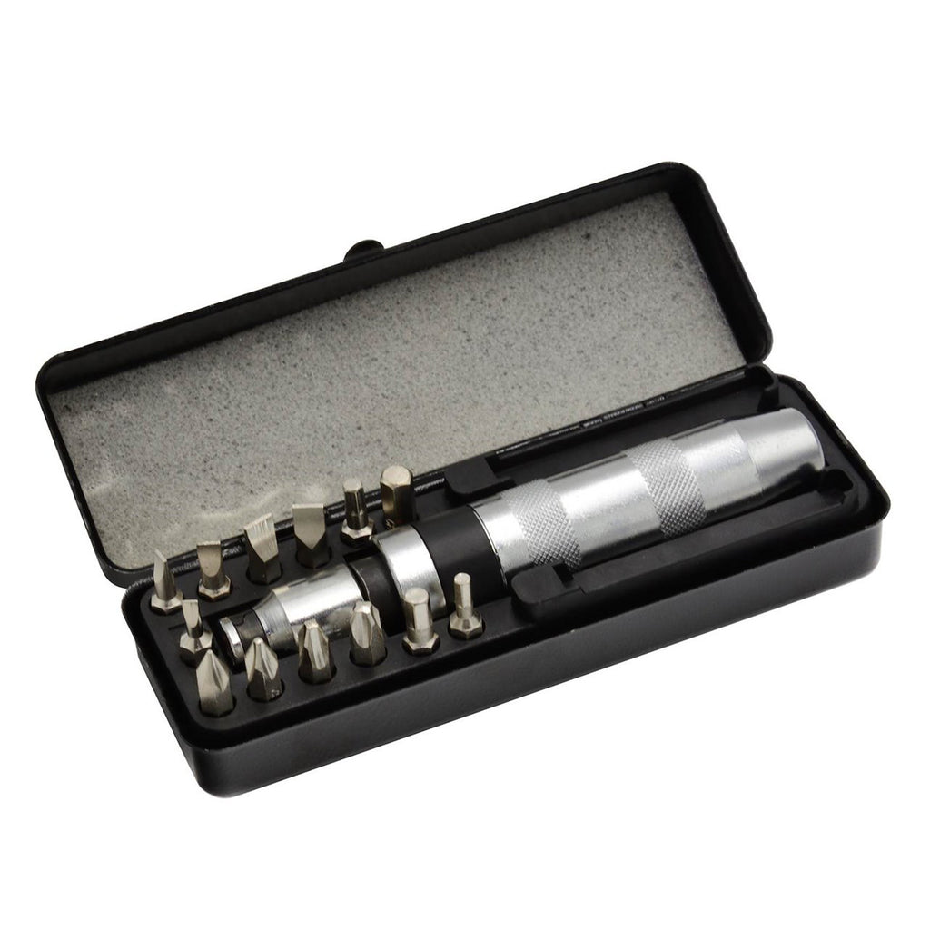 Ez az ÜTVE CSAVARHÚZÓ KÉSZLET 13 DB GEKO 15 darabos készletet tartalmaz: egy reverzibilis ütvecsavarhúzót, egy 1/2" x 8 mm hatszög adaptert és 13 darab 8 mm-es bitet króm-vanádium acélból (CrV).
