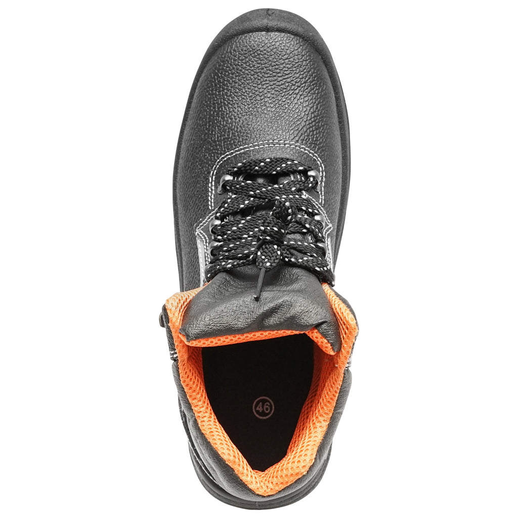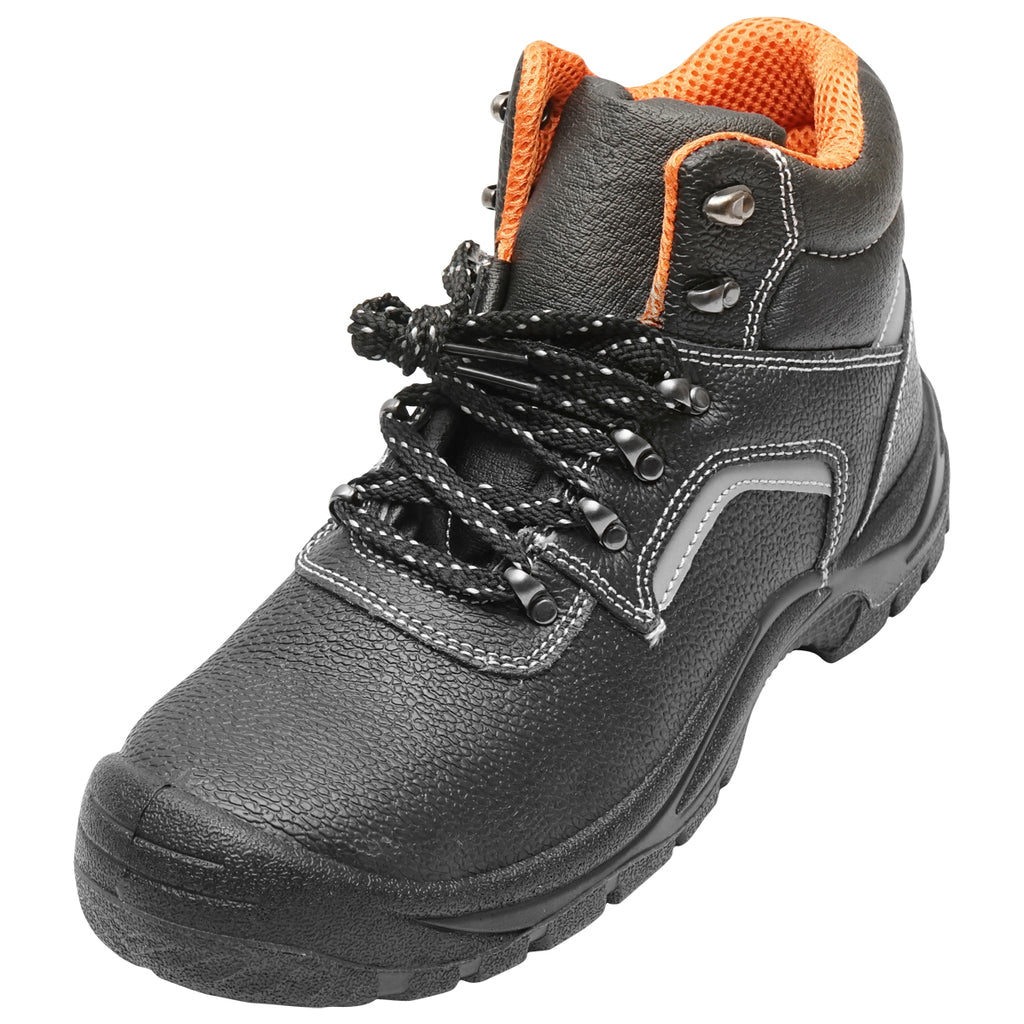 VÉDŐBAKANCS, 46-OS MÉRET, ACÉL LÁBUJJVÉDŐVEL ÉS TALPLEMEZZEL, TÍPUS: 5015 ipari és építőipari munkavégzéshez használható védőlábbelik. A bakancs acél orrmerevítővel van ellátva, amely 200 Joule energiájú ütések ellen véd, valamint fémbetétes talppal rendelkezik az átszúrás elleni védelem érdekében. A nagy sűrűségű talp sarokrésze ütéselnyelő kialakítású. A talp csúszásgátló, antisztatikus, továbbá ellenáll az olajoknak, üzemanyagoknak és vegyszereknek.