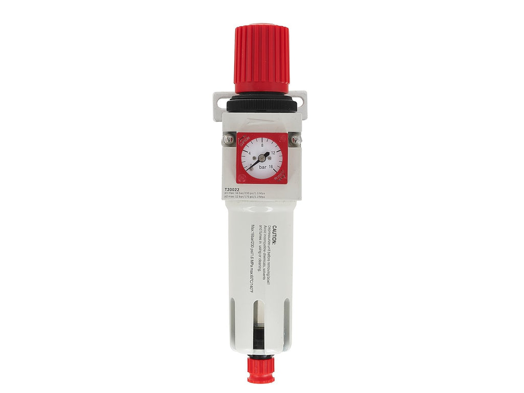 A ház alumíniumötvözetből, a szűrőpohár pedig polikarbonátból készült, amelyet egy további fém védőréteg borít. A készülék beépített manométerrel rendelkezik, 0–16 bar (0–230 psi) skálával, amely lehetővé teszi a nyomás pontos ellenőrzését.